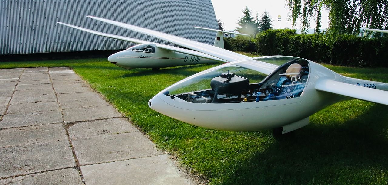 Für die waren die Bedingungen heute angenehm aber nicht ideal, erläutert Fluglehrer Otto am morgen. Der Sicht ist gut, die Sonne scheint nur die Wolken sind etwas zu wuchtig und zerreißen die Thermik, auf die die Segelflieger angewiesen sind. Mit der Pirat kann man aus 1000 Meter Höhe rund 25 Kilometer weit gleiten, findet man die passenden Aufwinde kommt man noch weiter, erzählt der Pilot weiter. Die Pirat tut das zuverlässig seit 40 Jahren, ihre Holzkonstruktion ist bei richtiger Pflege und Lagerung nahezu unverwüstlich. Der moderne Kollege aus Leichtmetall hat zwar eine höhere Gleitleistung, wird aber am Ende wohl weniger Dienstjahre unter dem Flügel haben.