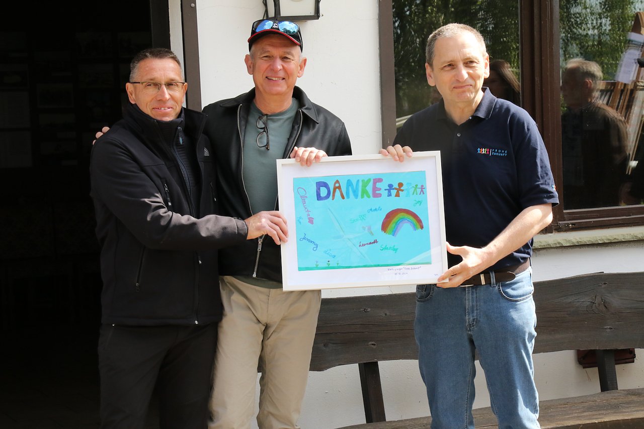 Die Kinder der Frohen Zukunft haben ein eigenes "Dankeschön" für die Flieger angefertigt, das hier von Chef der Frohen Zukunft Gert Bufe (links), an Mario Rieche und Mario Wielke übergeben wird (Foto: agl)