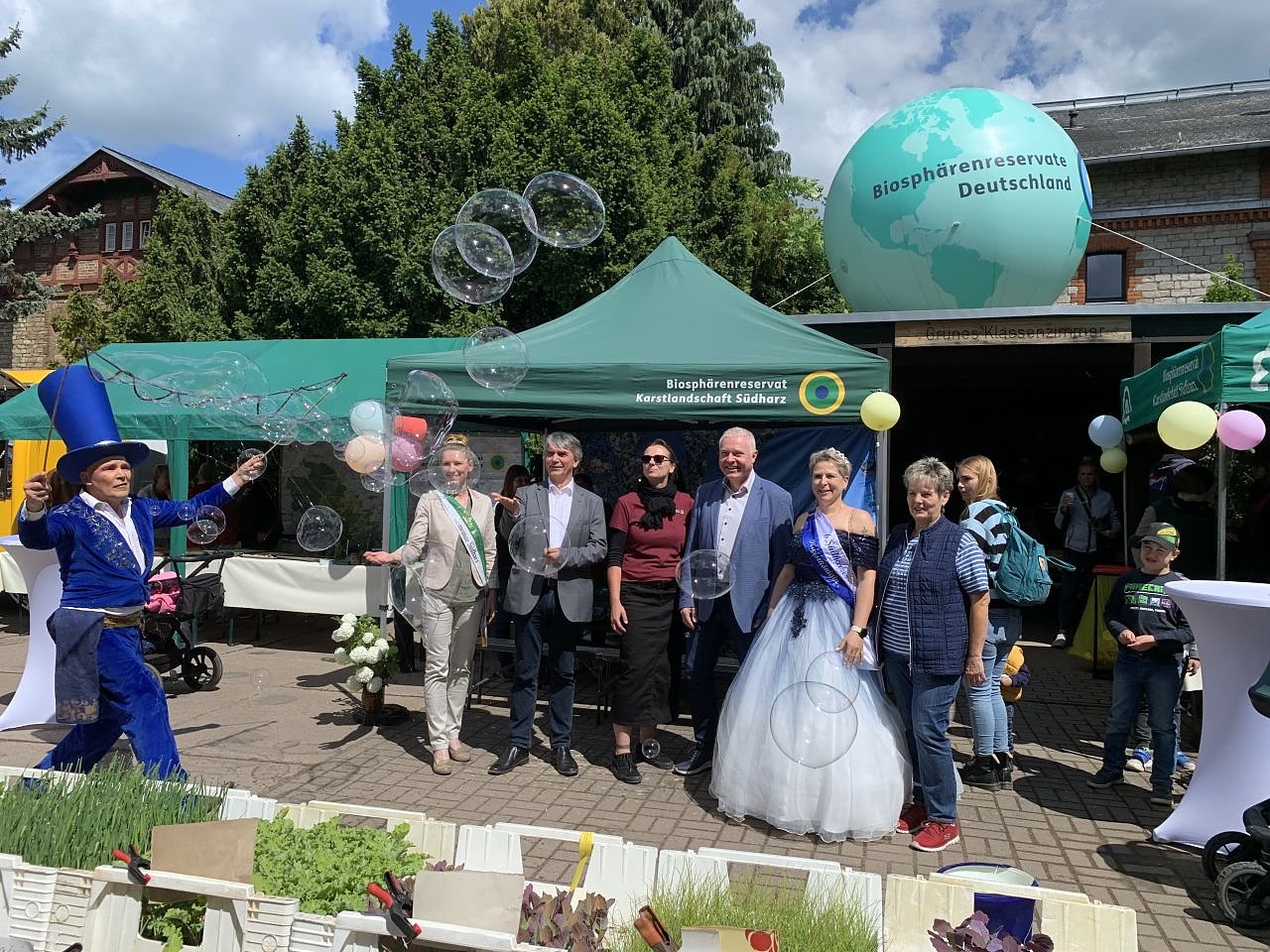 Trotz des tristen Verwaltungsgebäudes verwandelte sich der Hof in Roßla für einen Tag in einen lebendigen Ort der Begegnung: Zahlreiche Besucher und Besucherinnen – darunter auch Vertreterinnen und Vertreter aus Politik, Verwaltung und regionaler Wirtschaft – nutzten die Gelegenheit, sich über die Arbeit des Biosphärenreservats und seiner Partner zu informieren.