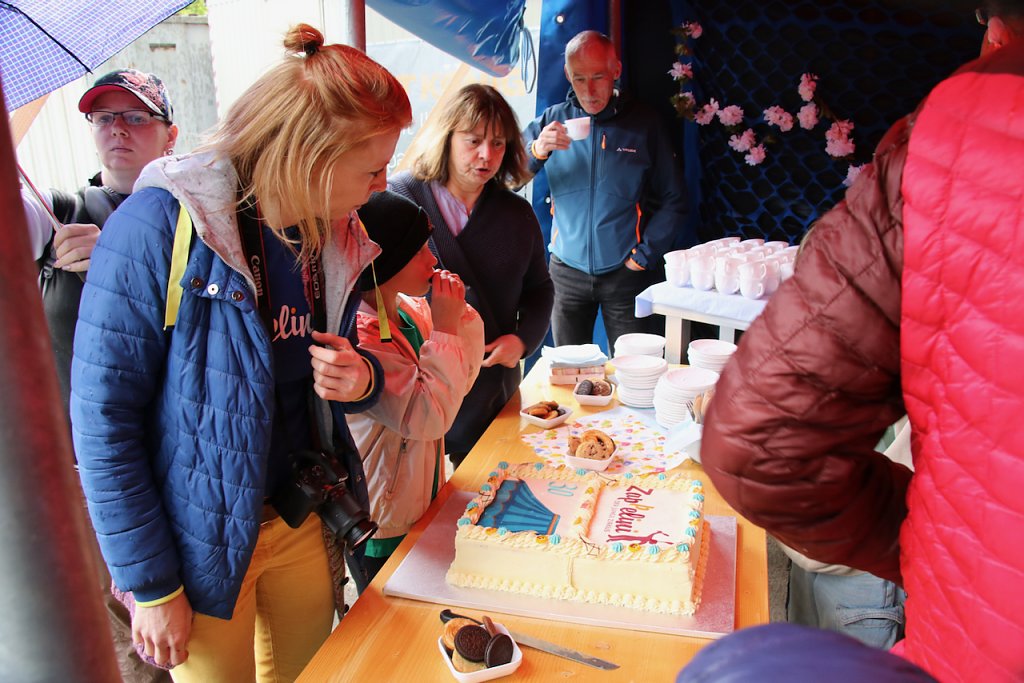 Kein Geburtstag ohne Kuchen - trotz Regen ließ man es sich am Nachmittag vor dem Zelt gut gehen (Foto: agl)
