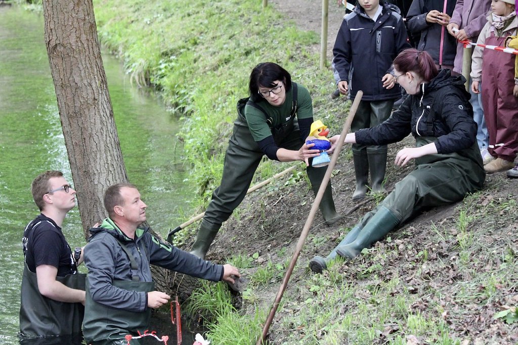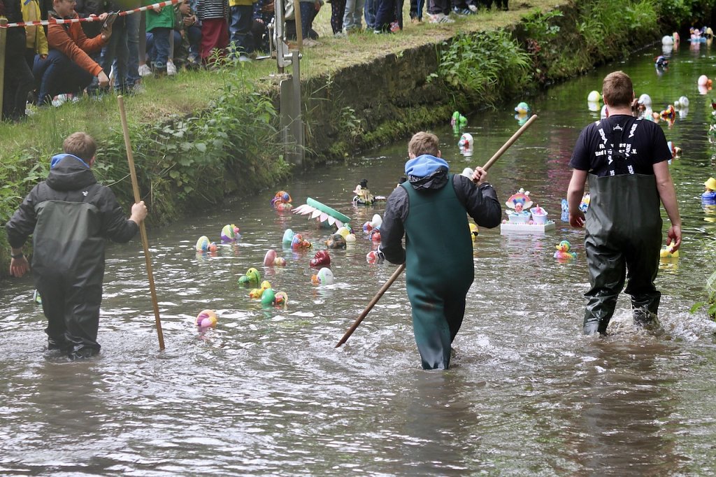 Die zehn Erstplatzierten gewinnen erneut tolle Preise der zahlreichen Sponsoren des Langensalzer Entenrennens, auch die am schönsten präparierten Exemplare sollen am Ziel im Riedgraben wieder geehrt werden und die vorletzte Ente bekommt einen Ehrenpreis. Wie unsere Bilder belegen waren wieder junge und alte, große und kleine Entenfans unterwegs und fieberten mit ihren bunten und exzentrischen Schützlingen. Diese glänzten wieder in faszinierenden Ausschmückungen, einige gleich in ganze Gärten eingebettet, andere als Familie von Donald Duck auf einem Floß zurecht gemacht. Die Phantasie der Bad Langensalzaer kannte auch in diesem Jahr keine Grenzen (siehe Galerie).