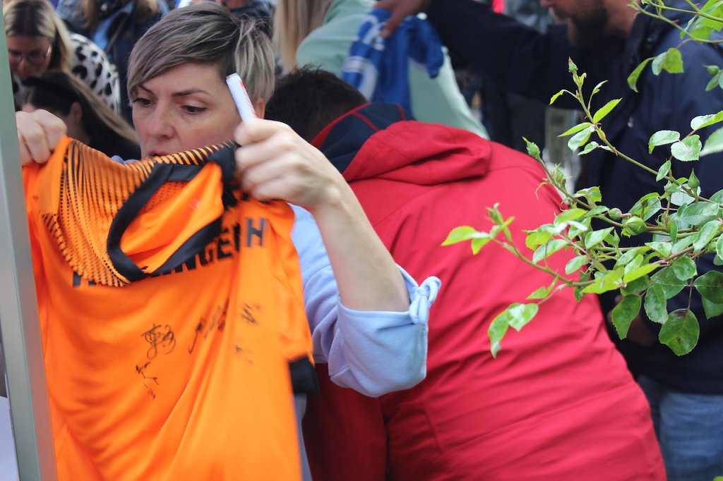 Hunderte Fans der berühmt-berüchtigten Roten Wand fanden sich bei kühlem Frühlingswetter ein, um sich eine Stunde lang Autogramme geben zu lassen oder Selfies mit den Spielerinnen zu schießen. Der Champions-Trainer Herbert Müller, selbst längst ein Urgestein des Vereins, bedankte sich bei allen, die am Erfolg mitgewirkt hatten und beschrieb, wie nach dem Bundesligaspiel gegen Bensheim etwas entstand, das sich wie eine Welle anfühlte und eine Dynamik innerhalb der Mannschaft entfachte, die zum Tsunami wurde, der letztlich das Team zu den Siegen gegen Dijon und Iskander getragen hat. In Graz feierte der Thüringer Handball seinen bisher größten Triumph und zu den sieben Deutschen Meistertiteln gesellt sich nun dieser außergewöhnliche internationale Erfolg. Der Sieg gestern runde die ganze Saison ab und es sei ein hervorragender Abschluss, lobte der Coach seine Mädels, die Gesellschafter im Hintergrund und die treuen Fans, die den Verein überallhin begleiteten.