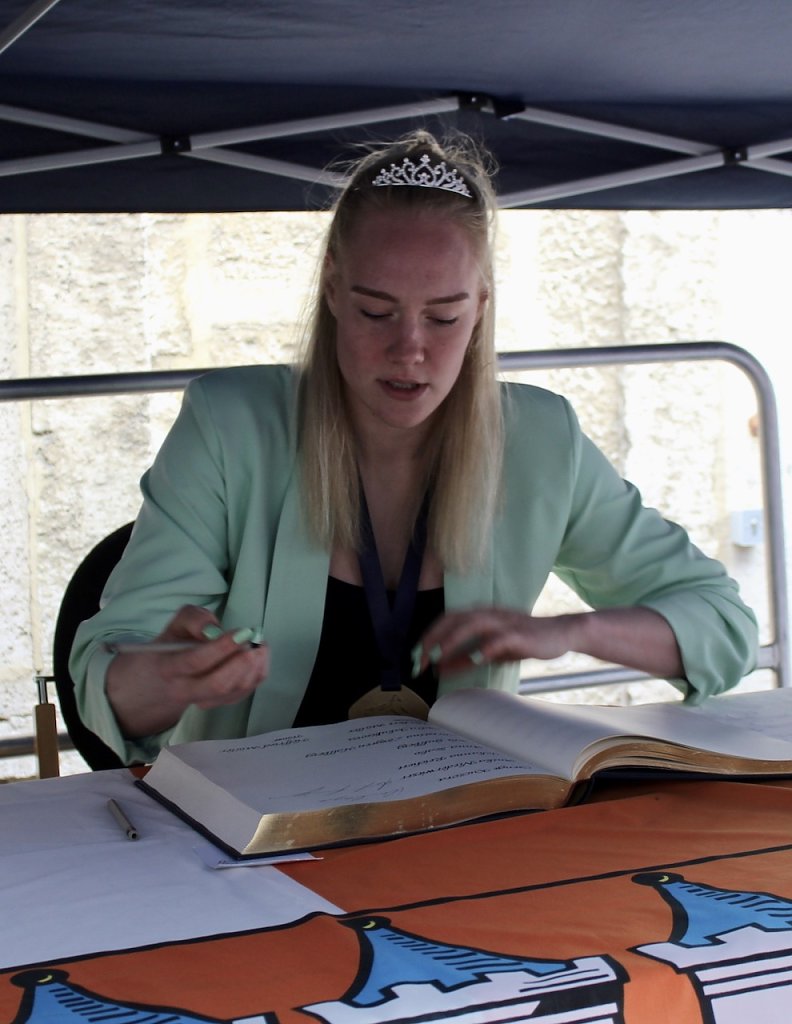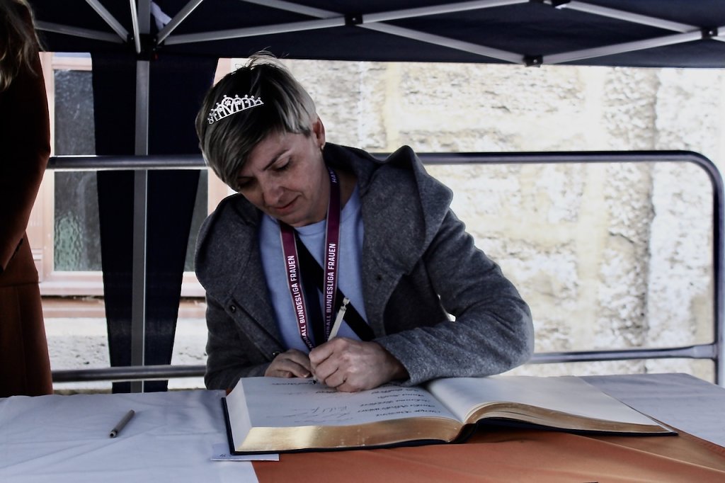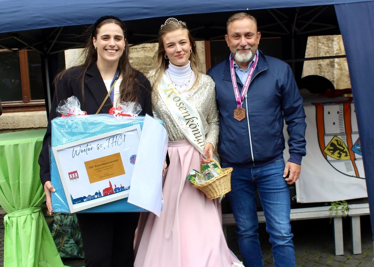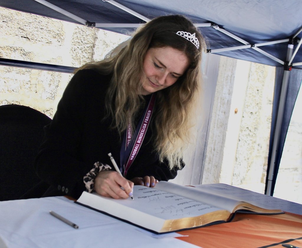 Bad Langensalzas Bürgermeister, Matthias Reinz, sprach voller Stolz und Dankbarkeit für die Verwaltung und die Bürger der Stadt, denen die Ehre zuteil wurde, Herberge eines europäischen Sportchampions zu sein. Um den ehrenden Akt für alle Fans zugänglich zu machen fände die Eintragung bis Goldene Buch im Freien an der Rathausmauer statt und nicht im Ratssaal. Im Namen der gesamten Stadtverwaltung schenkte er den Europacup-Siegerinnen einen Baum, der im Stadtgebiet eingepflanzt nachhaltig an diesen historischen Erfolg erinnern solle. Auch die Rosenkönigin Maxima empfand es als große Ehre dabei sein zu dürfen und den Handballerinnen quasi als Glücksfee auch im nächsten Jahr zu dienen, für das sie maximale Erfolge wünschte.