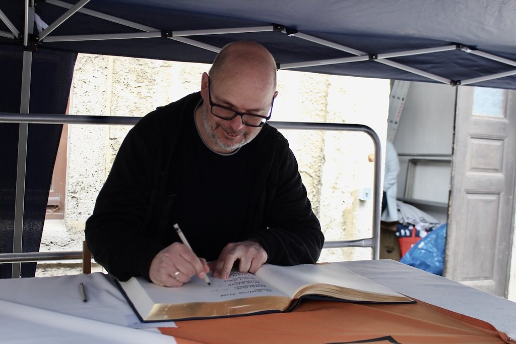 Herbert Müller, Trainer des Thüringer HC und Vater des Erfolges, trägt sich in das Goldene Buch der Stadt Bad Langensalza ein (Foto: Eva Maria Wiegand)