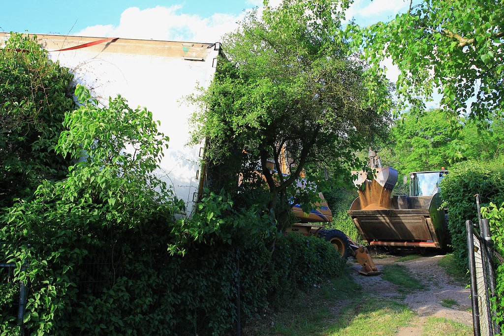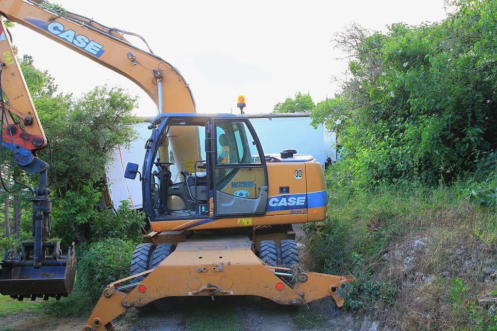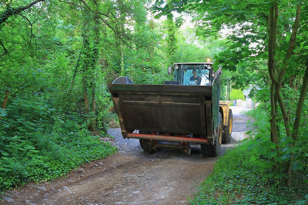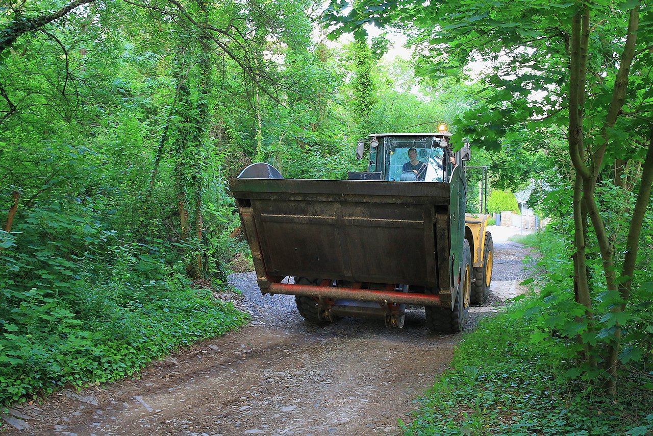 Vor Ort musste mittels Bagger und Radlader die Ladung aus dem Auflieger geborgen werden, der Radlader musste knapp einen Kilometer zum Sammelpunkt fahren, um dort wiederum seine Ladung auf bereitstehende Anhänger umzuladen.