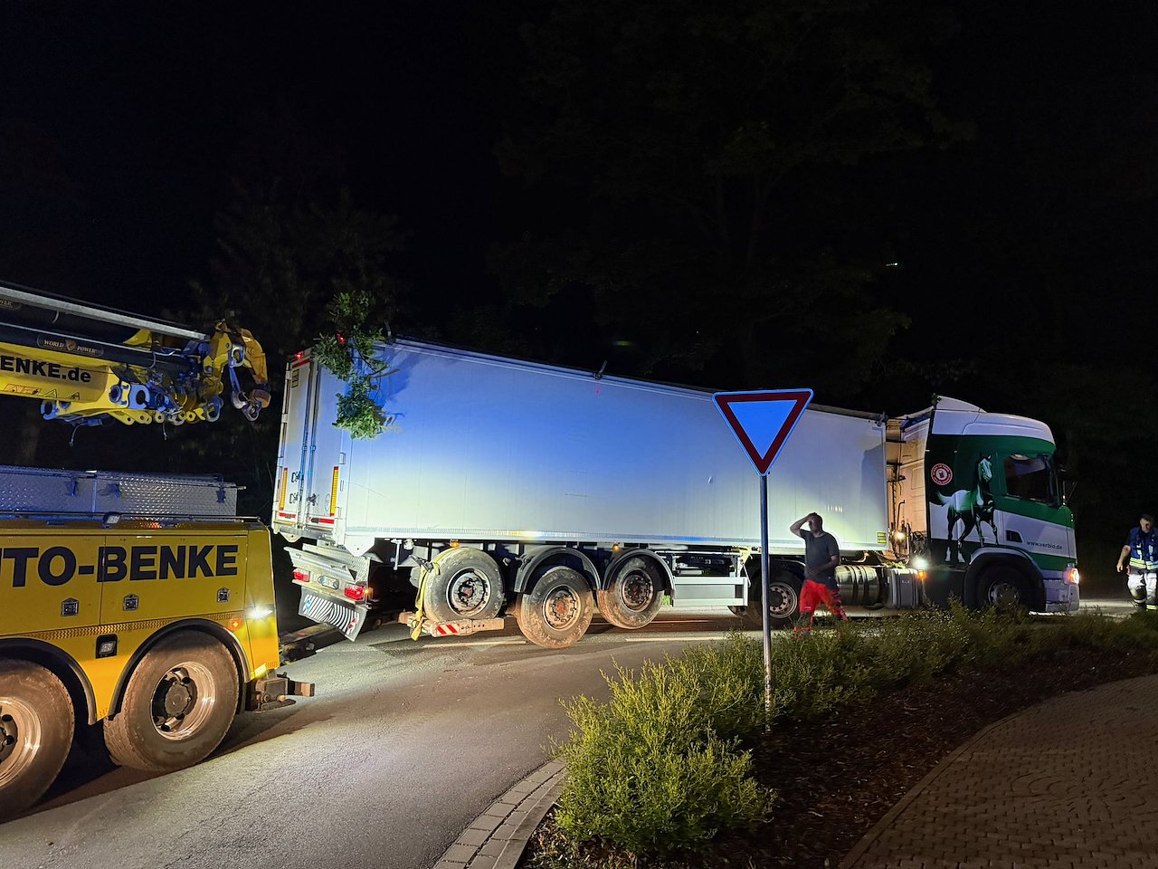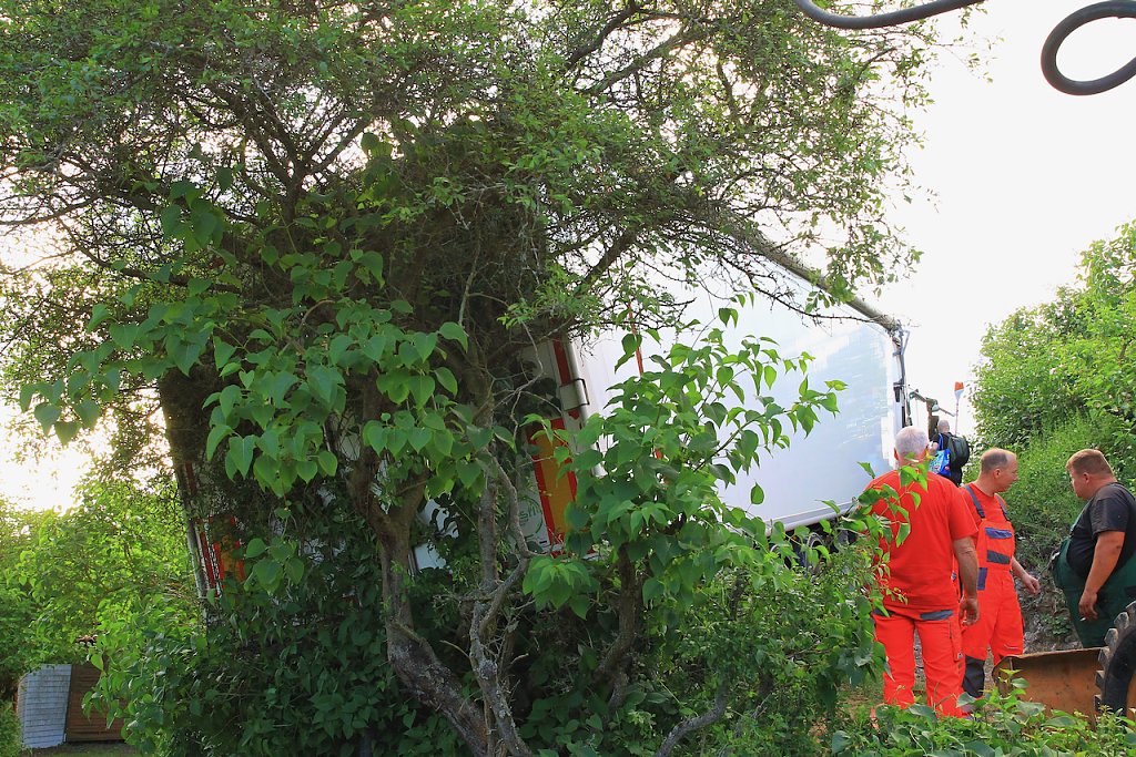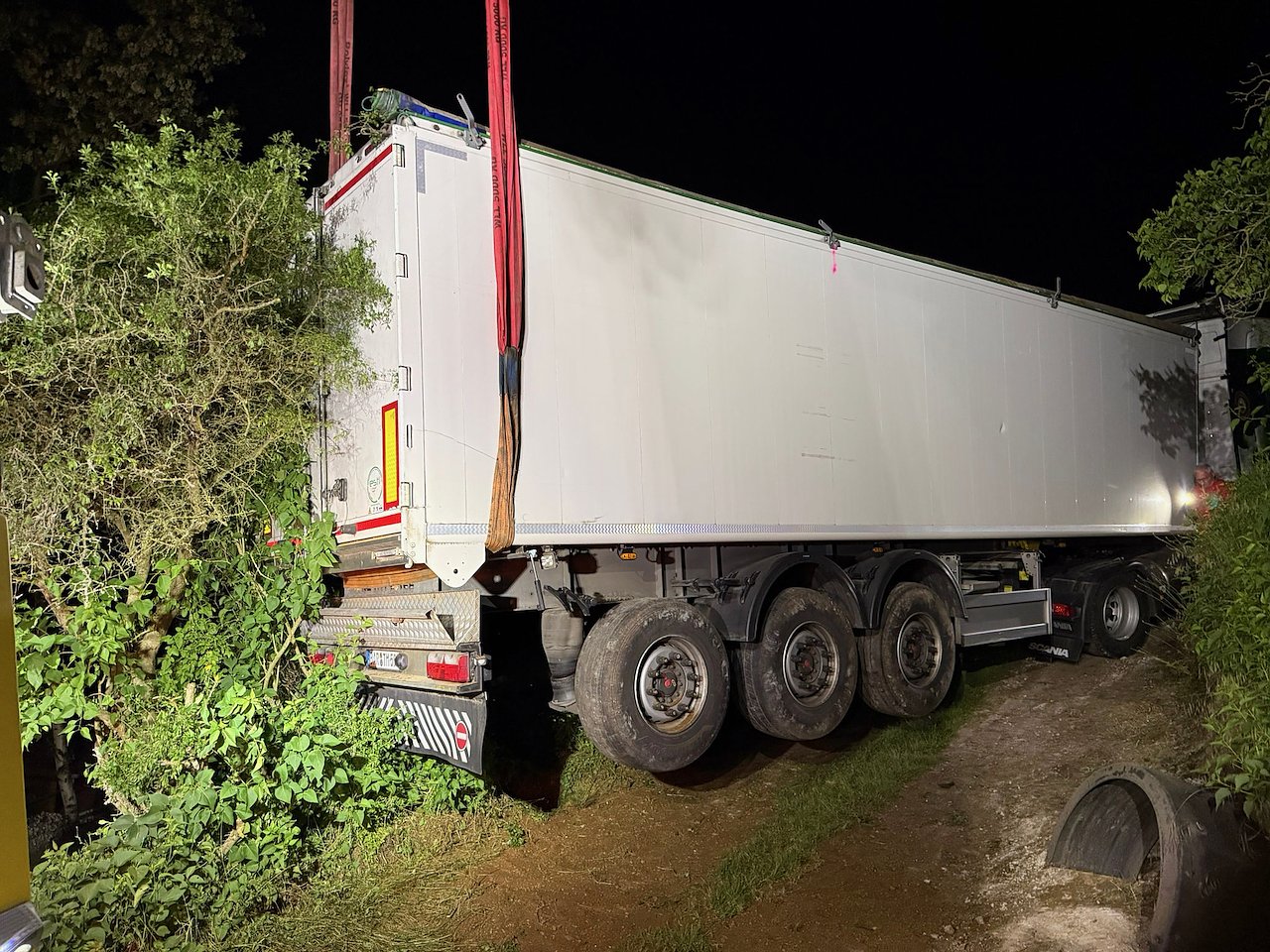 Ein Mitarbeiter des Bergeunternehmens musste dazu die Sattelzugmaschine steuern, auch hier ging es für ihn einen Kilometer rückwärts. Links und rechts neben den Fahrzeugen waren teilweise keine 10 cm Platz. Gegen 00:45 Uhr hatte der Sattelzug wieder "festen Boden unter den Räder".