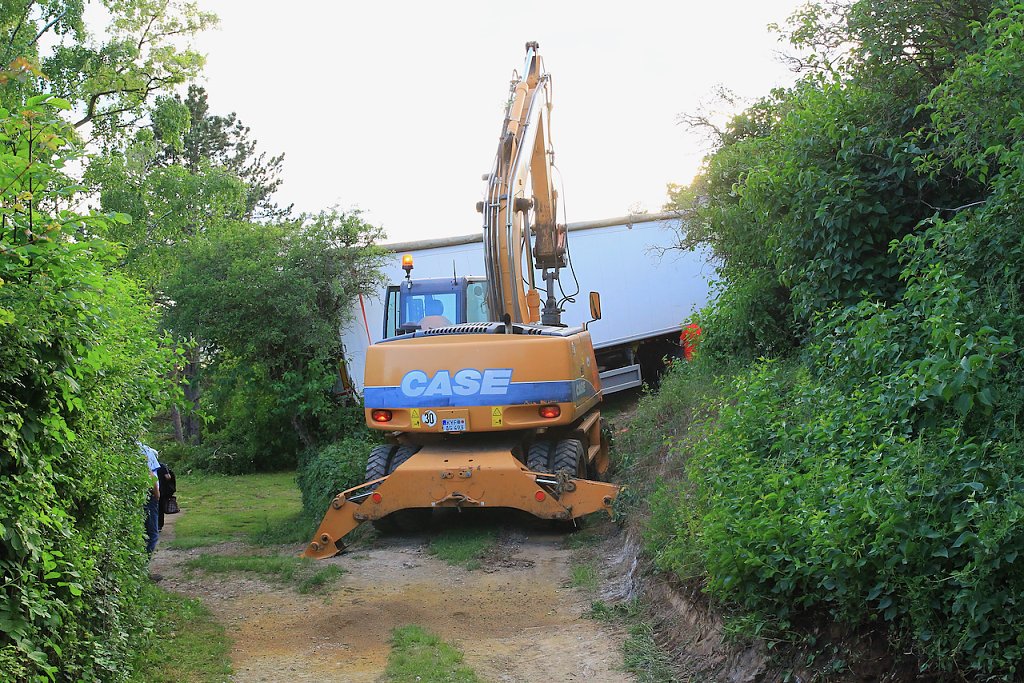 Nachdem der Sattelauflieger mittels Kran auf den Weg gehoben worden war wurde dieser im Anschluss mittels Abschleppklaue angehoben. Nun konnte in Schrittgeschwindigkeit, Stück für Stück, die Rückfahrt beginnen.
