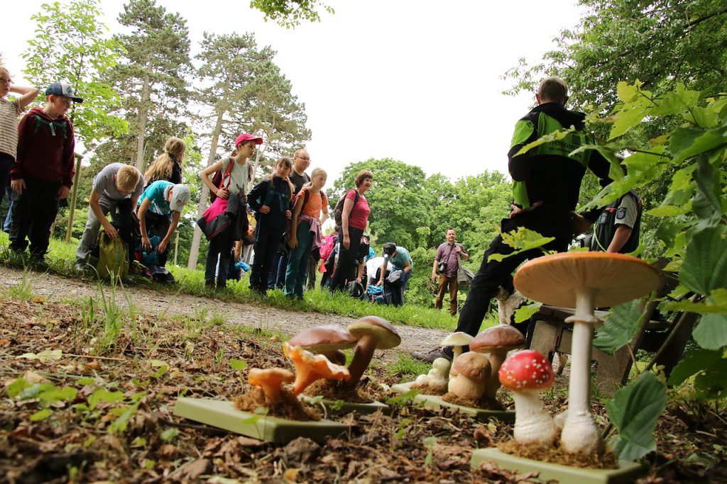Geweihe und Horn richtig identifizieren, Pilze einordnen, Spuren finden - es gab für den Nachwuchs reichlich zu tun. Ein Highlight war Falkner Reiner Gulyasch aus Stöckey, der seine Greifvögel mitgebracht hatte, darunter einen eindrucksvollen Steinadler, den die Kinder aus nächster Nähe betrachten konnten.