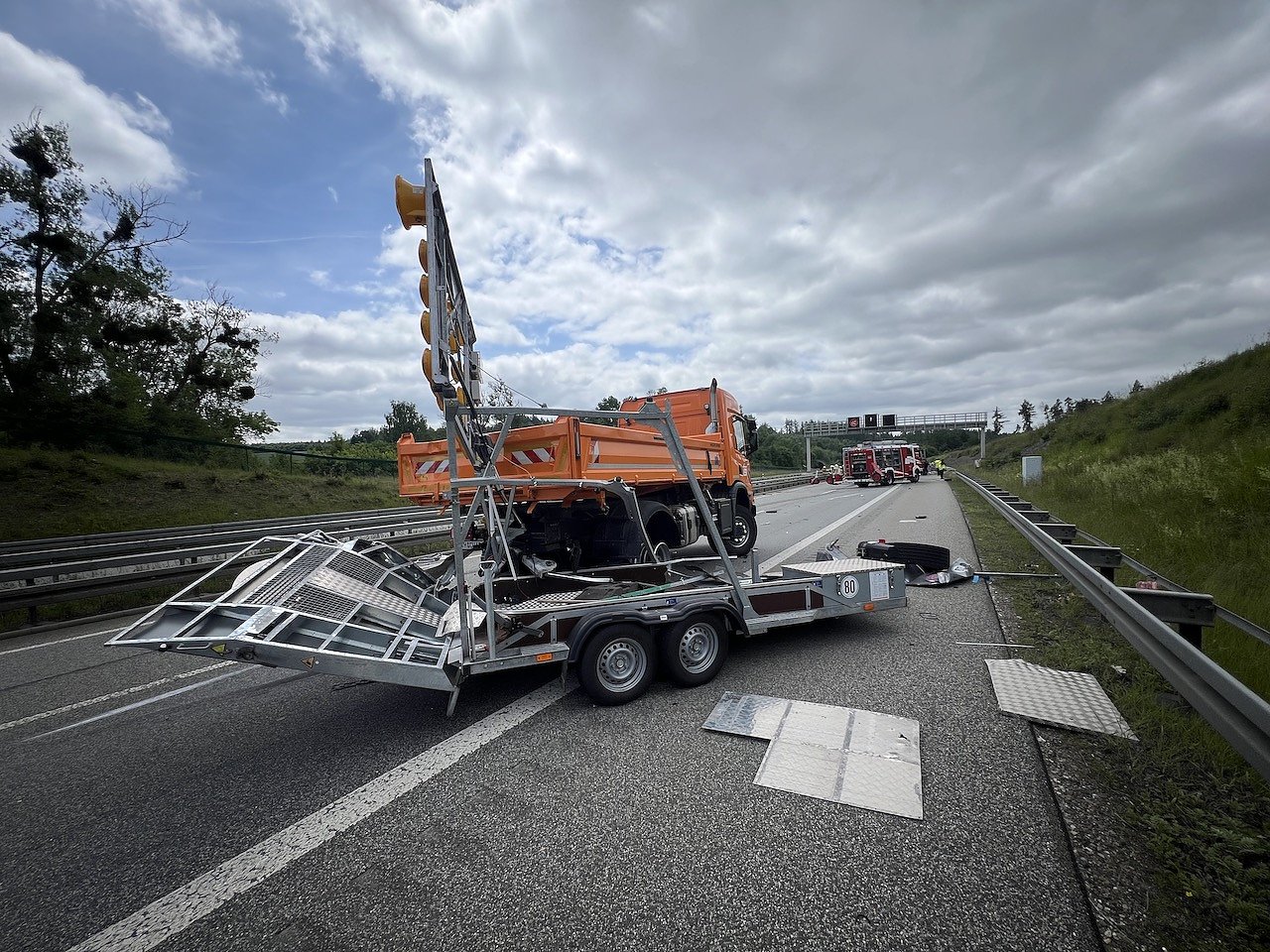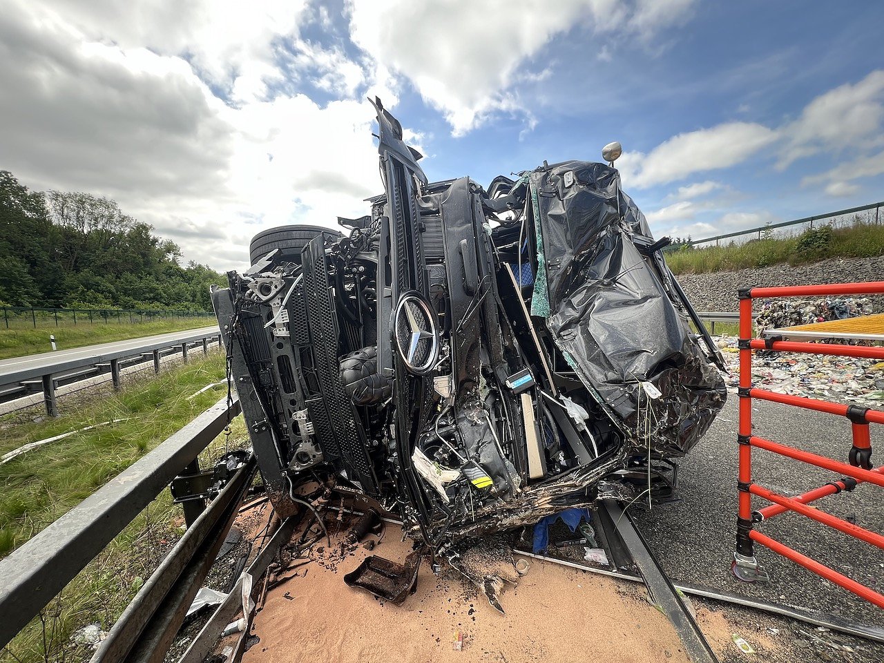 Dabei wurde der Schilderwagen zerstört, der Unfall- LKW geriet nach links von der Fahrbahn, prallte beim Gegenlenken in die rechte Leitplanke und stürzte um.