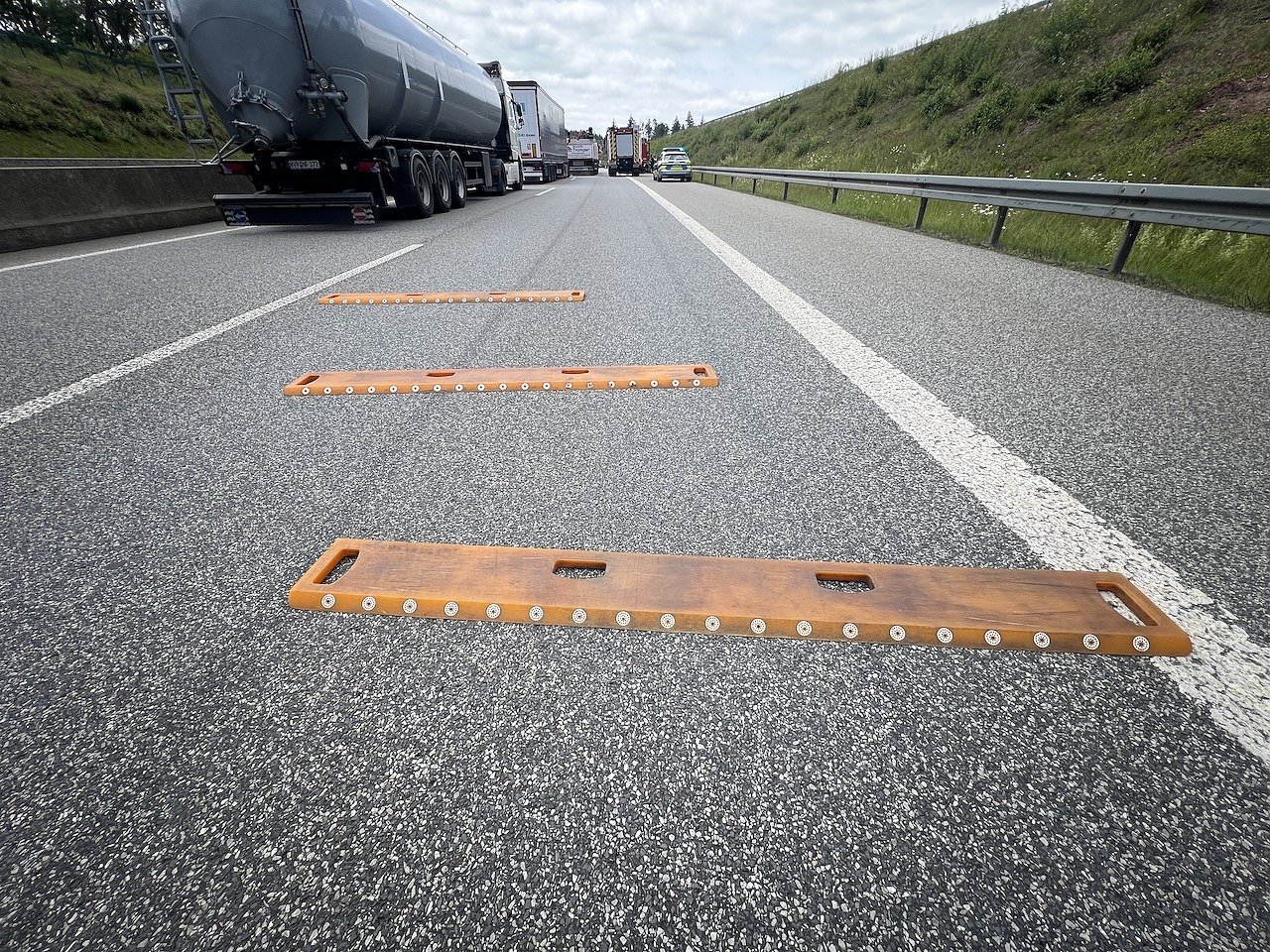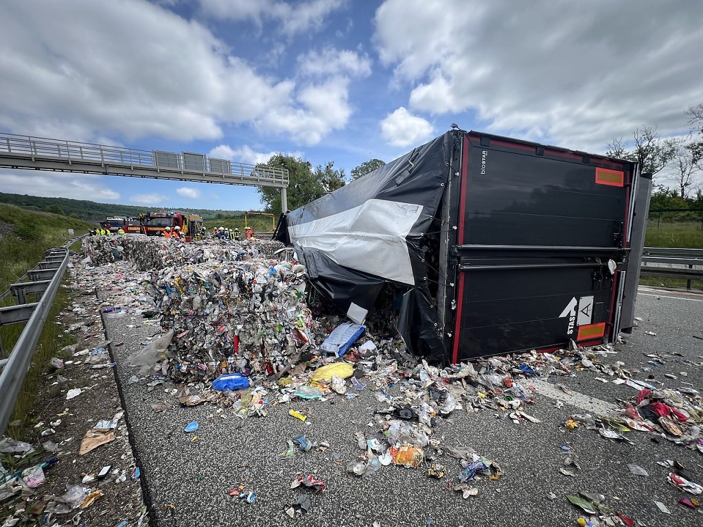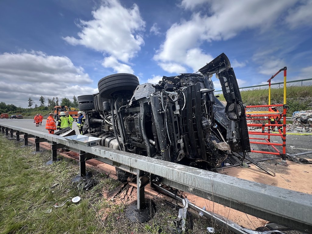 Die LKW-Fahrerin wurde bei dem Unfall aus dem Fahrzeug geschleudert und tödlich verletzt. Der mit Plastikabfällen beladene LKW liegt auf beiden Fahrspuren, der Sachschaden wird momentan auf 165.000 Euro geschätzt.