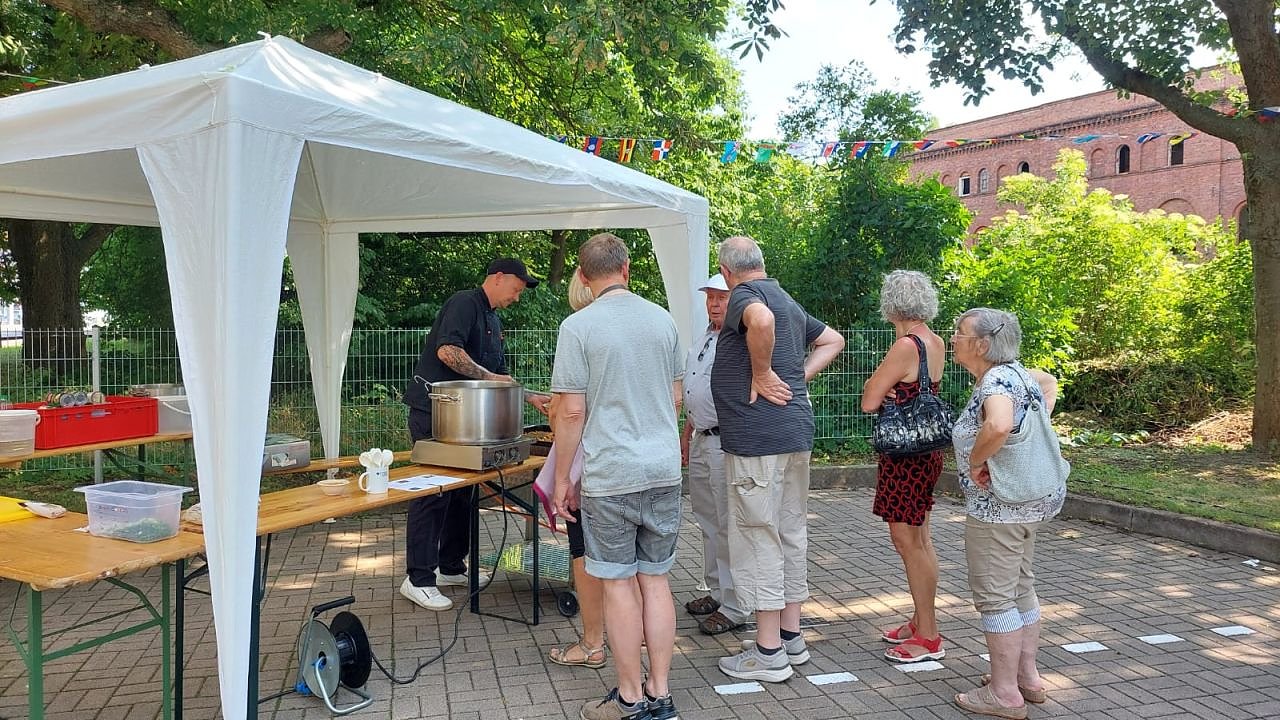 Etwas 40 Interessierte, darunter mehrere ausländische Kursteilnehmer verbrachten so einige gesellige Stunden auf dem Hof der VHS in der Nordhäuser Grimmelallee.