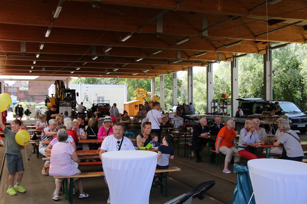 Für Verpflegung ist gesorgt und unter dem Dach des Depots lässt es sich trotz sommerlicher Temperaturen gut aushalten. Gefeiert wird noch bis 15 Uhr.