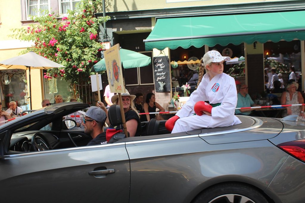 Trotz der tropischen Temperaturen waren viele Schaulustige an der Strecke und jubelten den tapferen Mitstreitern des Festumzuges zu. Von Kindergärten und Grundschulen über Spielmannszüge, Trommelgruppen und ehemaligen Rosenköniginnen bis hin zu Vereinen verschiedenster Couleur sowie den städtischen Betrieben und Institutionen bewegten sich die mehr als 60 Bilder am Nachmittag durch die Stadt.