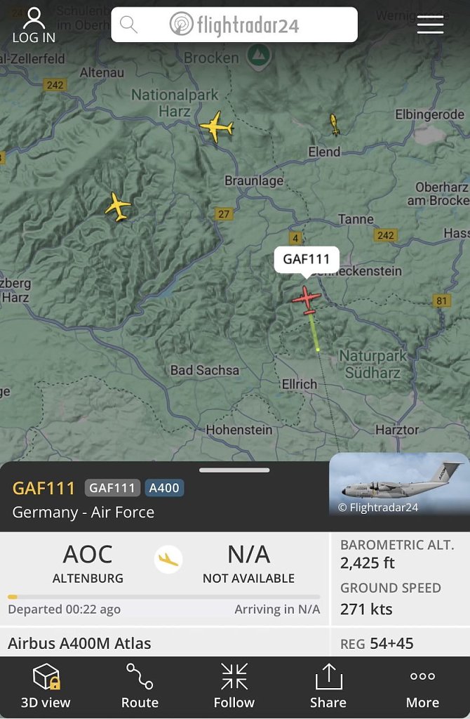 47 dieser Maschinen sind dort stationiert. Die Maschine am heutigen Tag befand sich nach Auskunft des Bürgerservice auf einem für den militärischen Flugbetrieb für Luftfahrzeugbesatzungen zum Zwecke der Aus- und Weiterbildung angesetzten Flug.