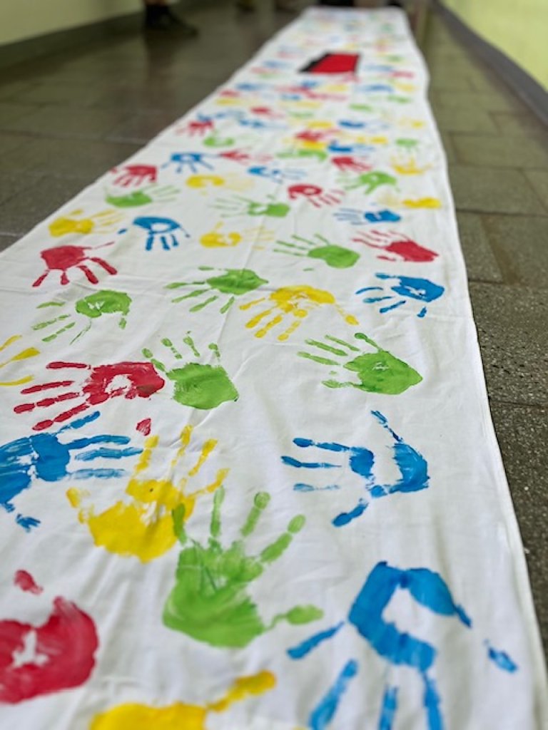 Die anderen Kinder waren dann an den kreativen Stationen beschäftigt. Es wurde also nicht nur getanzt, sondern auch ein Bühnenbild gestaltet. Drei riesengroße Banner mit der Aufschrift WIR aus weißen Tischtüchern, gesponsert von Miettischdecke.de, bekamen eine Vielzahl von bunten Handabdrücken der Kinder. Die Erzieherin Frau Siebenhüner war für die Station zuständig, denn sie nähte schließlich auch die Tischtücher als Banner zusammen.
