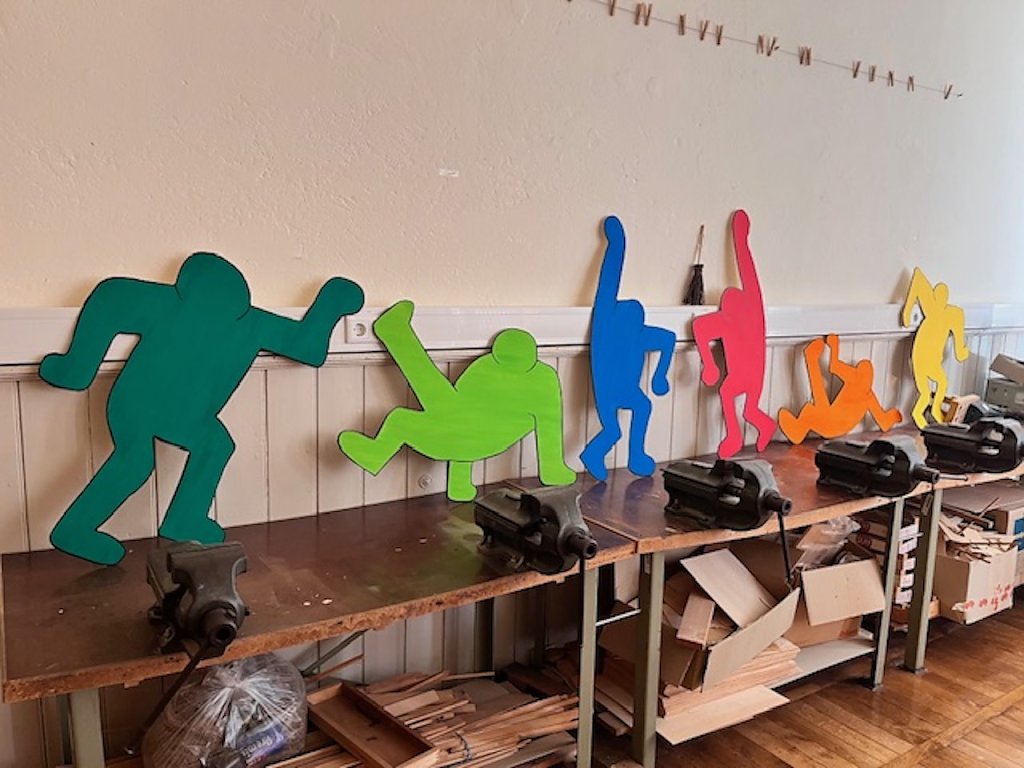 Diese sollen auch weiterhin für Dekorationszwecke, wie beispielsweise zum Hexenfest im Oktober genutzt werden. Zusätzlich wurde auch im Werkraum fleißig gesägt, geschliffen und gepinselt. Hier entstanden sechs große tanzende Figuren aus Sperrholzplatten. Diese kommen nach der Renovierung der Umkleidekabinen der Turnhalle an die Wand und bringen frischen Wind in die sonst so kahlen Umkleideräume.