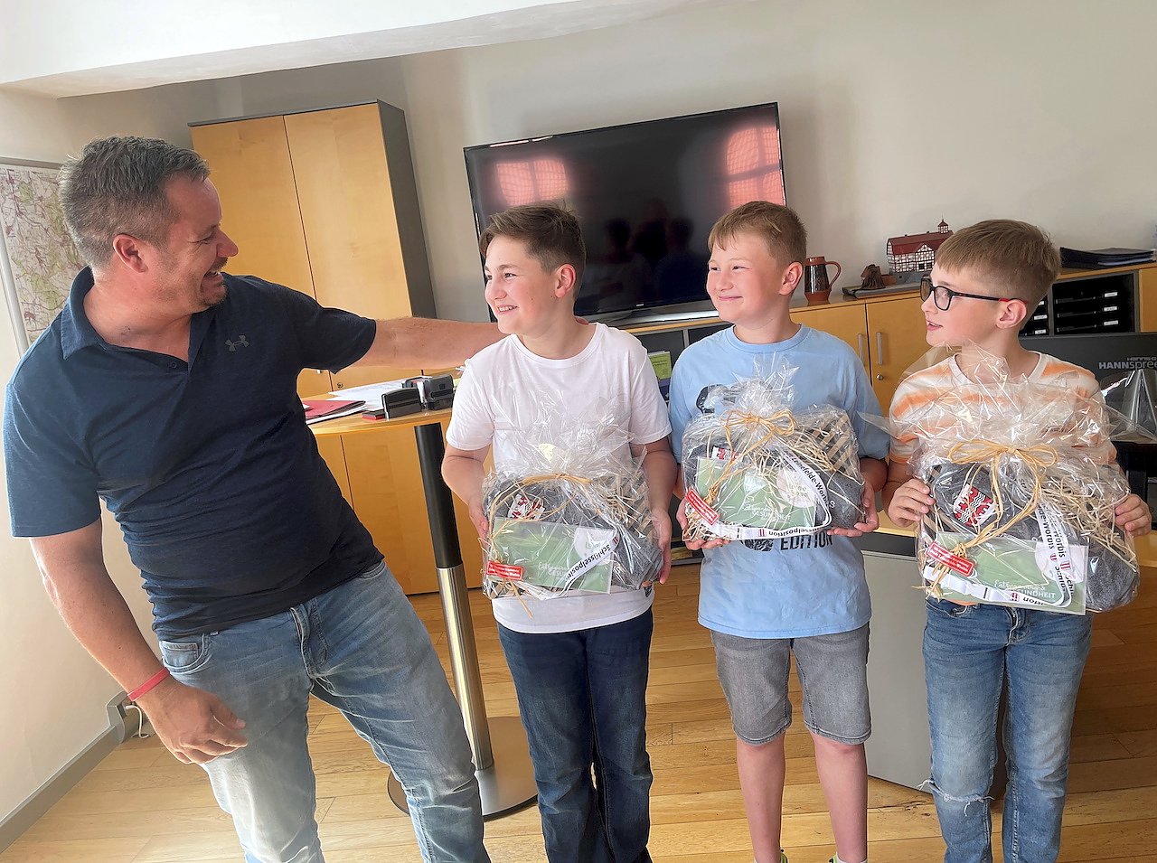 Die umsichtigen Finder erwartete einige Tage später eine besondere Überraschung. Bürgermeister Christian Zwingmann lud sie zusammen mit Oskars Eltern und Bruder in sein Büro ein. Hier konnte sie ihre Geschichte nochmal in Ruhe erzählen. Als Dankeschön, dass sie so vorbildlich gehandelt haben, bekamen die Jungen Geschenke vom Bürgermeister, die unter anderem Gutscheine fürs Leinebad enthielten. Gustav bekam auch ein Präsent und darf natürlich mit.