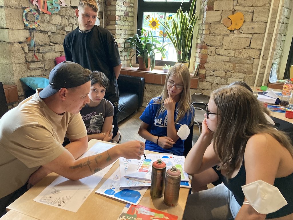 Am Anfang der Woche hieß es aber erst einmal etwas über Kinderrechte und Werte zu erfahren und gemeinsam darüber zu sprechen. Welche Rechte und Werte haben Kinder und Jugendliche, welche Rechte kennen sie überhaupt und können sie ihre Rechte hier ausleben? All diese Fragen wurden besprochen und diskutiert. Dann wurde es auch schon künstlerisch kreativ. Die Teilnehmer konnten ihre Gedanken und Ideen nun zu Papier bringen.