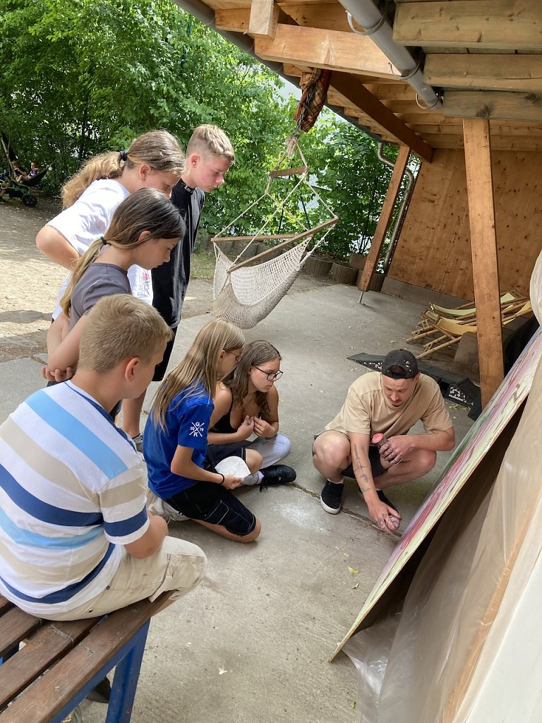 In einem demokratischen Abstimmungsprozess wurde dann aus jedem Skizzenblatt ein Motiv jedes Teilnehmers ausgewählt, welches Final an die Wand gesprüht werden soll. Das entsprechende Wissen und die Techniken des Graffitisprühens zeigte im Anschluss Mathieu, der den Kindern und Jugendlichen immer mit Rat und Tat zur Seite stand.