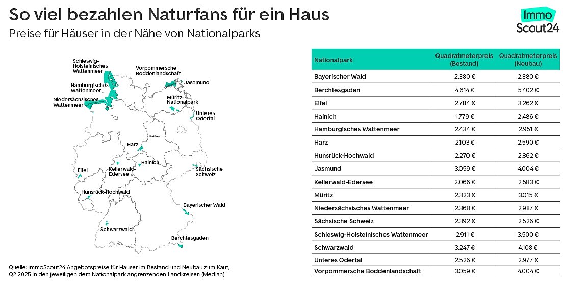 Unsere Daten zeigen zuletzt ein wachsendes Interesse am Wohnen im ländlichen Raum. Der Häusermarkt präsentiert sich dabei als besonders dynamisches Segment mit deutlich steigenden Preisen, sagt Daniel Hendel, Geschäftsführer von ImmoScout24. Nationalpark-Regionen spiegeln diese Entwicklung wider und zeigen, wie attraktiv naturnahe Wohnlagen geworden sind.”