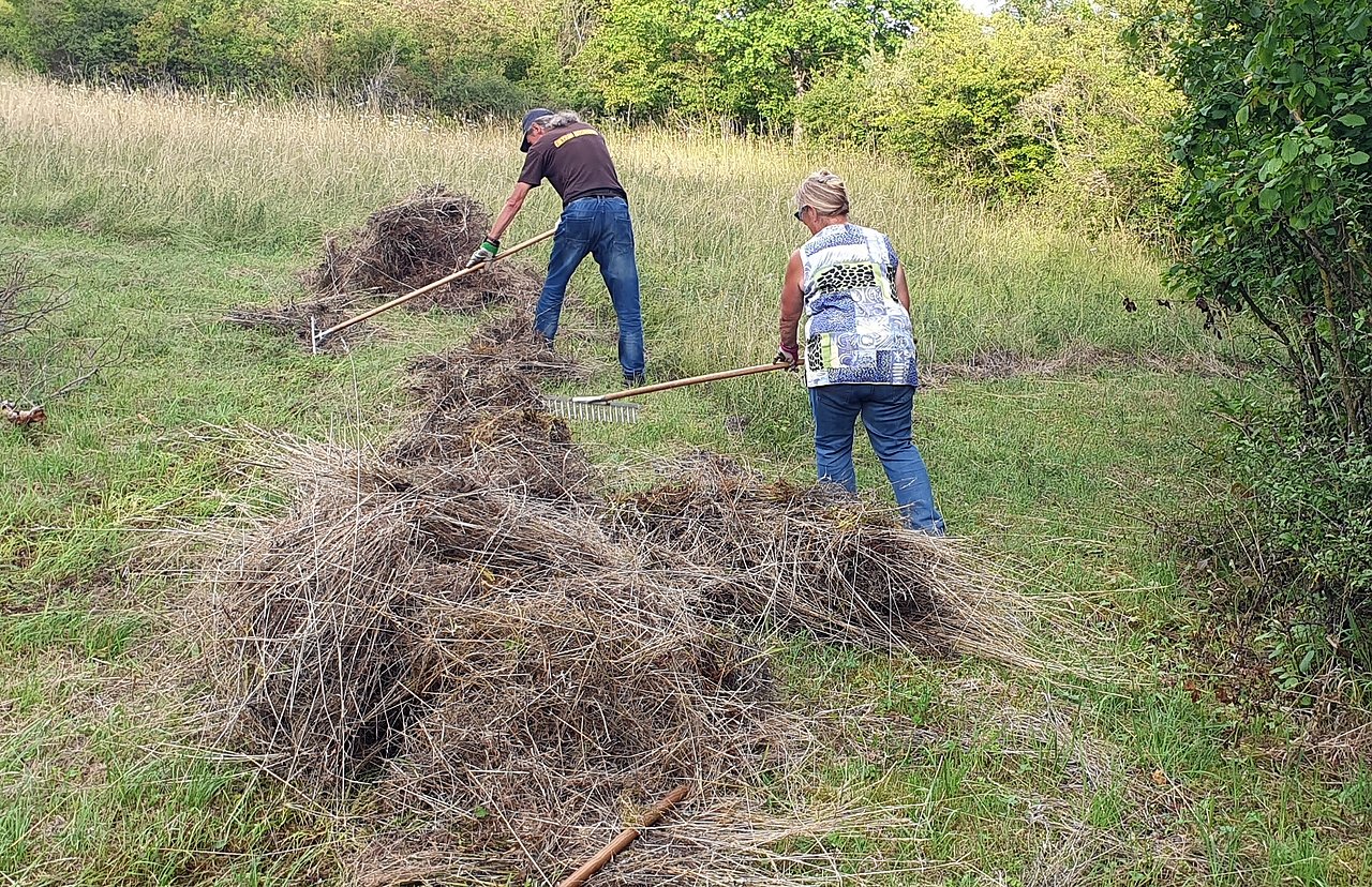 Kraft, Kondition und Naturliebe gehören bei der ehrenamtlichen Landschaftspflege zusammen. Zwei Enthusiasten harken am 24. Juli, um den wertvollen Magerrasen zu erhalten. (Foto: B. Schwarzberg)