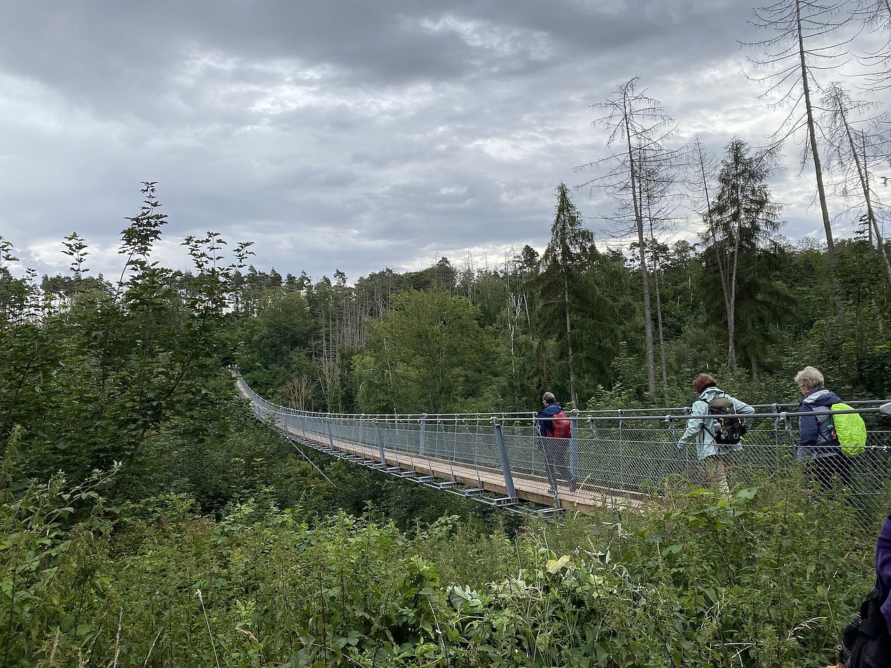 Unser Wanderführer ist leider krank geworden. Doch unsere frisch gebackene lizensierte Wanderführerin Brigitte übernahm kurzfristig. Vom Parkplatz in Gehofen ging es zunächst zum Rastplatz Unstrutblick und nach einer Pause weiter ins Bärental. Da hing sie vor uns. Mit 180 Meter Länge überspannt sie in 25 Meter Höhe das Tal. Beim Betreten der Brücke merkt man, dass sie schwankt. Das war nicht jedermanns Sache und nicht alle überquerten sie. Aber am Ende kamen auch die Mutigen wieder auf der Zugangsseite an. Brigitte hat ihre Aufgabe hervorragend gelöst.