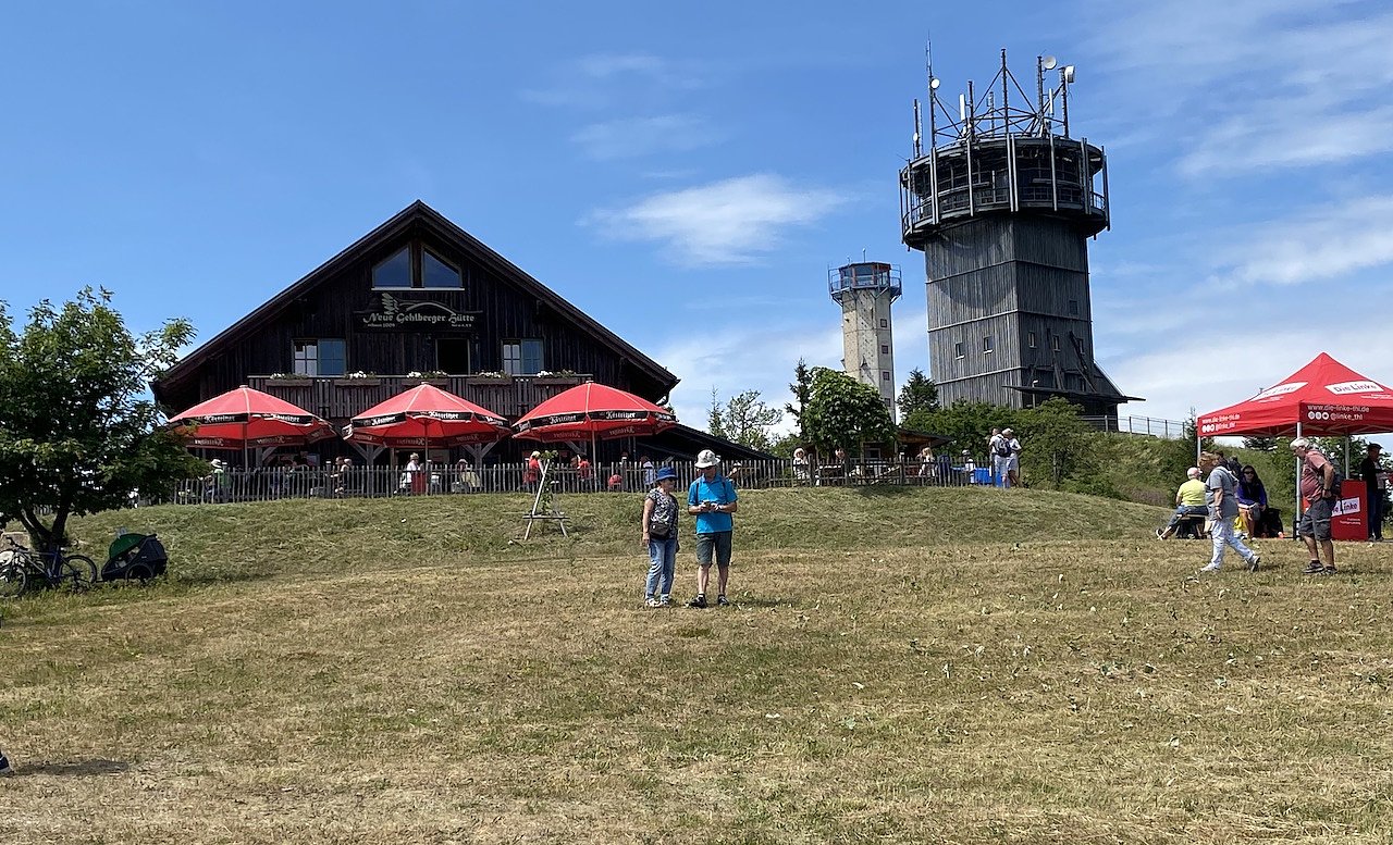 Hier oben treffen wir wieder unsere mitgereisten Wanderfreund. Da sie eine kürzere Wanderung gemacht haben, waren sie schon länger auf dem Gipfel. Hier oben war ein buntes Treiben. Am Turm erfolgte der Zieleinlauf des vom Rennsteiglaufvereins organisierten Schneekopfgipfellaufs. An verschiedenen Ständen präsentierten sich diverse Wanderverbände neben Naturschutzverbänden und vielen Händlern, die Souvenirs, Bücher, Lebensmittel usw. anboten.