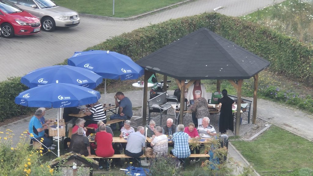 Ein ganz grosses Danke schön geht an das Kulturhaus Bleicherode für die Bereitstellung der Sitzgelegenheiten und der WBG Südharz für den Verleih der Sonnenschirme. Der selbst gebackene Kuchen der Bewohner kam sehr gut an, selbstgemachte Salate rundeten den Grillabend bei Würstchen und Steaks ab.