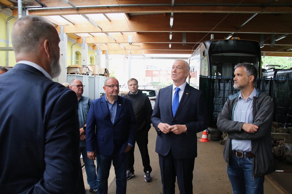 Thüringens Minister für Digitales und Infrastruktur, Steffen Schütz, (Mitte) war heute unter anderem im Straßenbahndepot der Stadt Nordhausen unterwegs (Foto: agl)