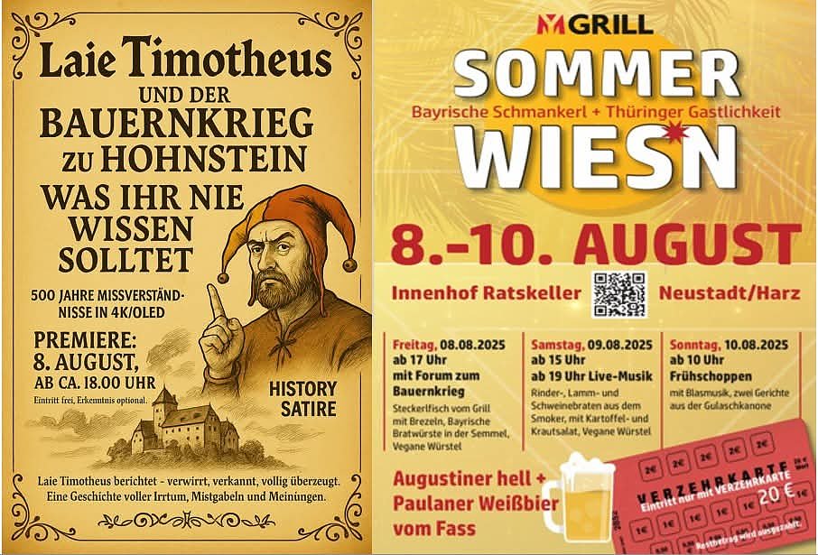 Am Freitag lodert im alten Hohnsteiner Land nicht nur das Lagerfeuer der Geschichte – es brennt ein ganz besonderer Abend voller Musik, Licht, Fakten und feiner Tropfen! Historisch-satirisch geht’s ans Eingemachte im Innenhof des Neustädter Ratskellers...