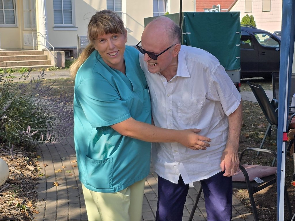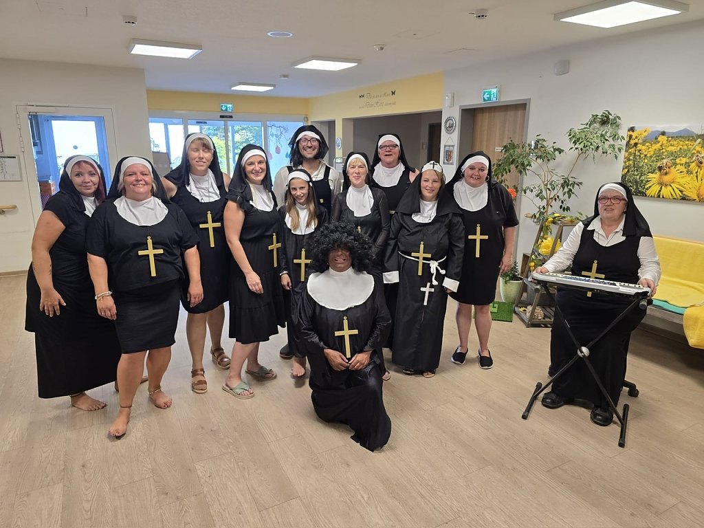 Viel gelacht wurde auch bei den diversen Auftritten der Mitarbeiter: nach einem Theaterstück Wenn der Topf aber nun ein Loch hat trat erst das Doublepärchen Romina & Albano Power mit dem Song Felicita und das Duett-Double Roland Kaiser und Maite Kelly mit Warum hast du nicht nein gesagt" auf. Das Highlight war dann zum krönenden Abschluss der Auftritt diverser Nonnen zu Sister Act. Hausmeister Basti bewies sich am Abend mit seinen Grillkünsten. Roster mit Kartoffelsalat ist und bleibt ein Muss bei den Bewohner-innen.