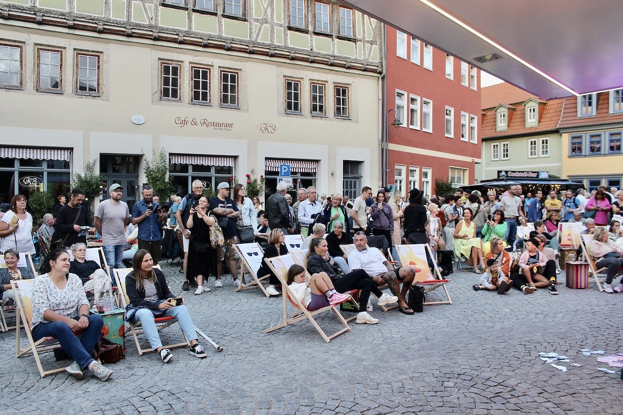 Prall gefüllt präsentierte sich der Kornmarkt gestern Abend, wo sich das indische Restaurant "Punjabi Bad’Sha" und die "Bar 947" um die erwartungsfrohen Gäste kümmerten und sie mit Speis und Trank versorgten. Auf der Bühne stand das Duo Crepes Sucette, das mit Geige und Gitarre einen musikalischen Ausflug auf den Balkan und die grüne Insel Irland unternahm. Dabei ließen sich die beiden Festivalerfahrenen auch vom kurzzeitigen Ausfall der Tonanlage nicht beeindrucken und lockten immer mehr Tänzer auf das mittelalterliche Pflaster des altehrwürdigen Marktplatzes.
