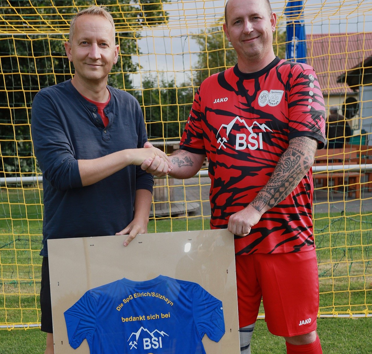 Auf Initiative von Lars Grabowski, selbst Altherrenspieler des SV Sülzhayn, konnte die Bergsicherung Ilfeld als neuer Sponsor und Werbeträger gewonnen werden. Vor dem Spiel bedankte sich Cheftrainer Mario Kurth im Namen beider Vereine für die großzügige Unterstützung. Lars Grabowski, Bauleiter bei der Bergsicherung Ilfeld, nahm den Dank stellvertretend entgegen. Ohne die tatkräftige Unterstützung regionaler Unternehmen wären viele Aktivitäten im Breitensport nicht möglich, manche Vereine könnten unter den heutigen Bedingungen kaum bestehen, so der Trainer.