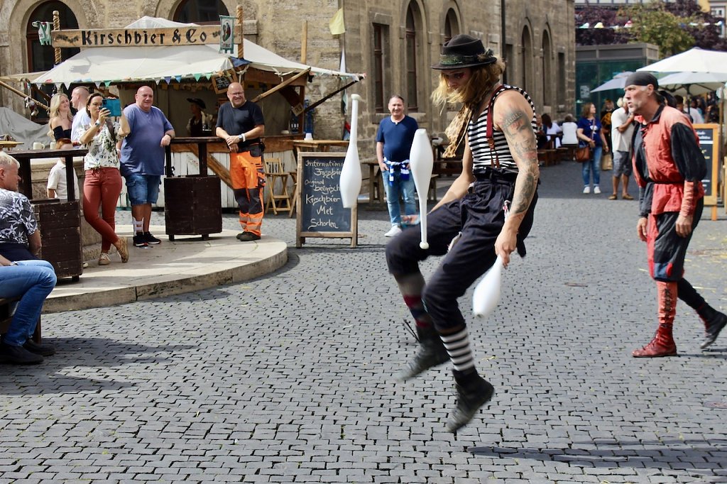 Erstmals dabei auch der neue Kreisfürst von Unstrut und Hainich, Thomas Ahke, der sich mit seiner Fürstin auf der Bühne zu Bürgermeister und Bürgermeisterin sowie der bezaubernden Rosenkönigin Maxima gesellte. Wo sie sich die flotten Sprüche des Herolds Radolf zu Duringen anhören durften. Dieser mittelalterliche Sprachmagier zelebrierte gemeinsam mit dem Gastgeberpaar um Mary Fischer die Vorstellung aller künstlerisch Beteiligten an diesem 31. Mittelalterstadtfest zu Langensalza.