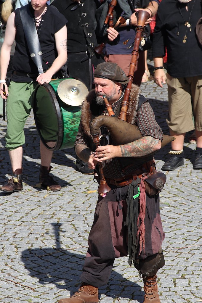 Wie schon so oft waren die offiziellen Wahrsagereien für den Wetterverlauf düster, noch am Donnerstag hätte man die Innenstadt gefühlt mit einem Schlauchboot befahren können, so hat es gegossen. Und selbst am Freitagvormittag sah es eher nach einer mittelalterlichen Schlammschlacht aus als nach einem Sommerfest. Doch wie immer in den letzten Jahren präsentierte sich das Mittelalterstadtfest allen Orakeln und Ängsten zum Trotz bei der Eröffnung mit herrlichem Sonnenschein bei angenehmsten Temperaturen. Die knapp einhundert Künstler, Musiker und Gaukler nebst Henker hielten ihren traditionellen Einzug auf dem Töpfermarkt, nachdem sie zuvor jubilierend durch die Stadt gezogen waren.