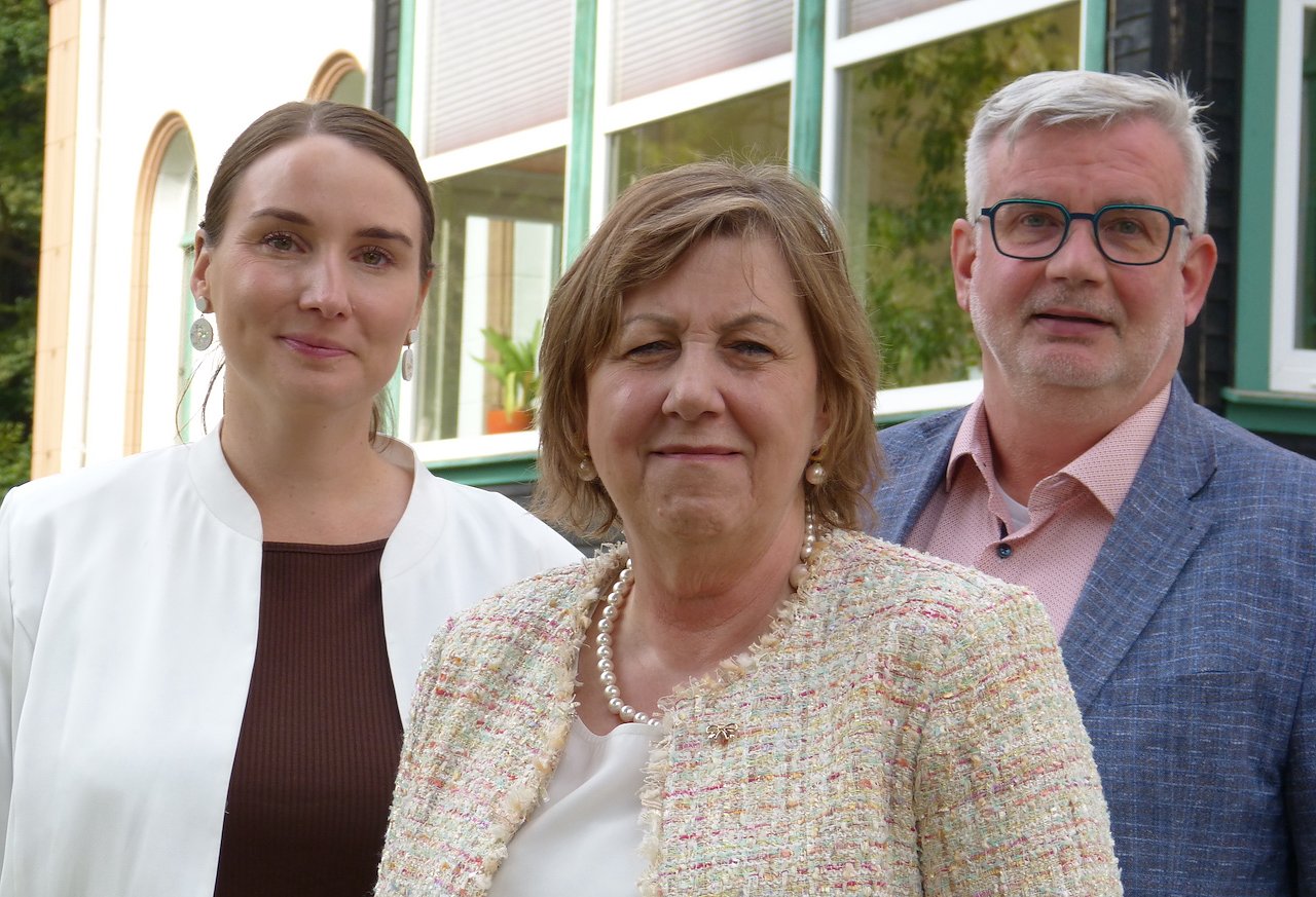 Thüringens Ministerin Katharina Schenk nahm sich viel Zeit, trug detailliert vor und wollte Fotos mit Auszubildenden -Klassen, die weiter aktiv begleitet werden sollen. Im Bild: Martina Röder, Deutscher Pflegeverband DPV und Neanderklinik Harzwald sowie der I. Beigeordnete des Landrates vom LK Nordhausen, Stefan Nüßle. Katharina Schenk ist die Thüringer Ministerin für Arbeit, Soziales, Gesundheit, Frauen und Familie. (Foto: Tim Schäfer)