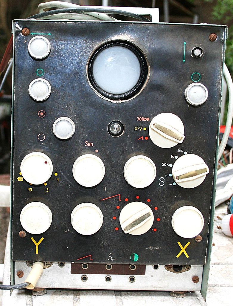 Dieses Gerät ist bestimmt über 70 Jahre alt. Es handelt sich um ein Kathodenstrahloszilleskop (KO), dass mithilfe eines Elektronenstrahls den zeitlichen Verlauf elektrischer Spannungen oder andere umwandelbarer physikalischer Größen auf einem Bildschirm darstellt...