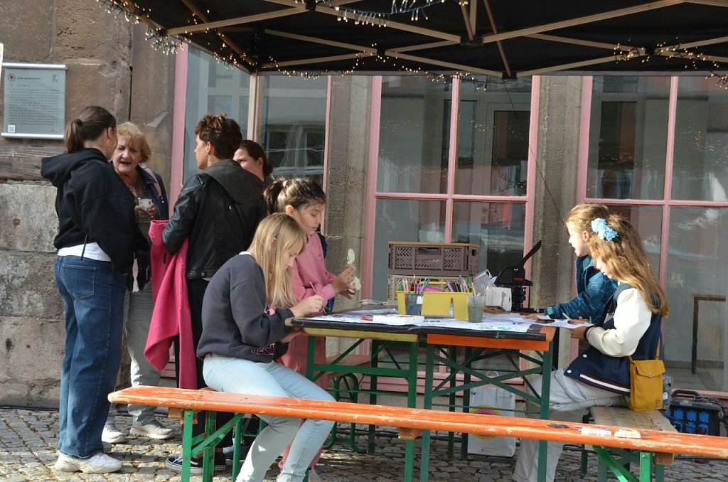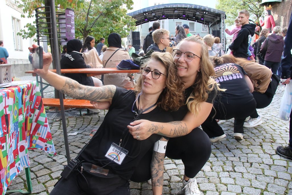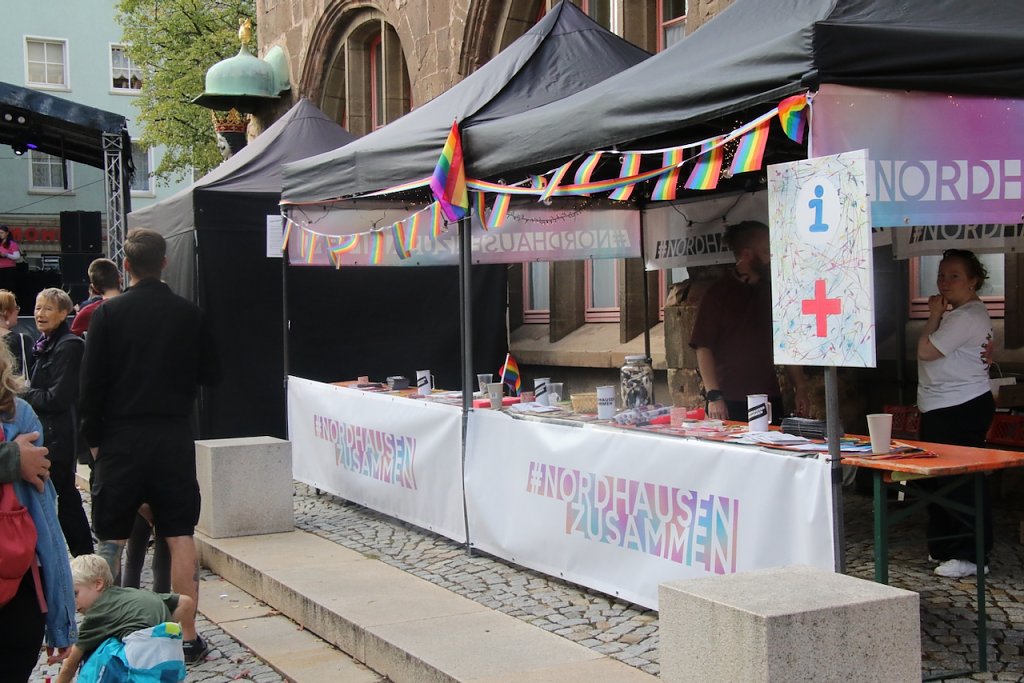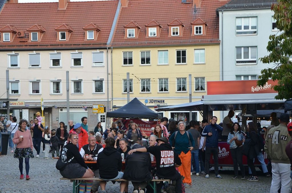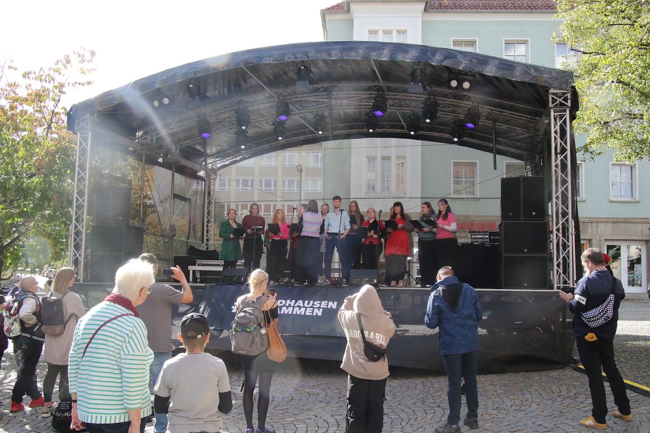 Mit Musik, gutem Essen, Spiel- und Spaß für die Kleinen und Redebeiträgen wie dem Hammers sichert man sich ab gegen die Einsamkeit der Sorge und will frohen Mutes feiern. Auf der Bühne stehen Menschen aus Nordhausen, etwa der Chor der pro vita der eine Ode an den Frieden zum Besten gab, wie auch Menschen die es hierher verschlagen hat, wie vier junge Mädchen aus der Gemeinschaftsunterkunft in Sülzhayn, die sich zum tanzen auf die Bühne getraut haben.