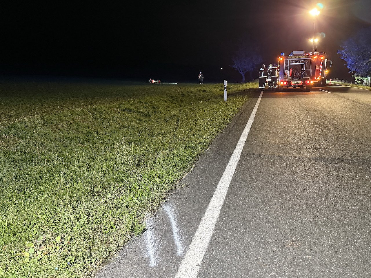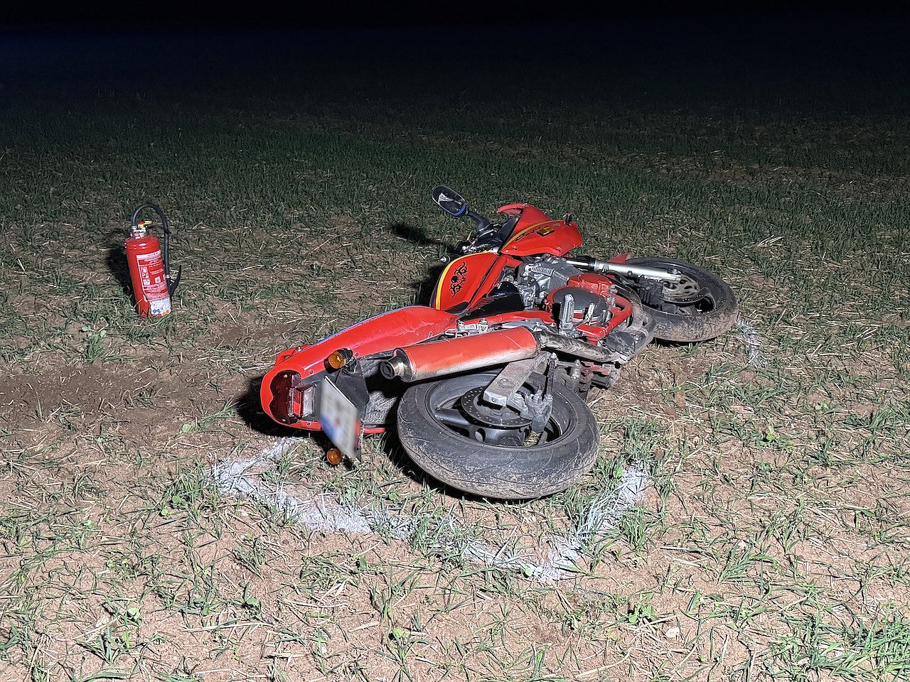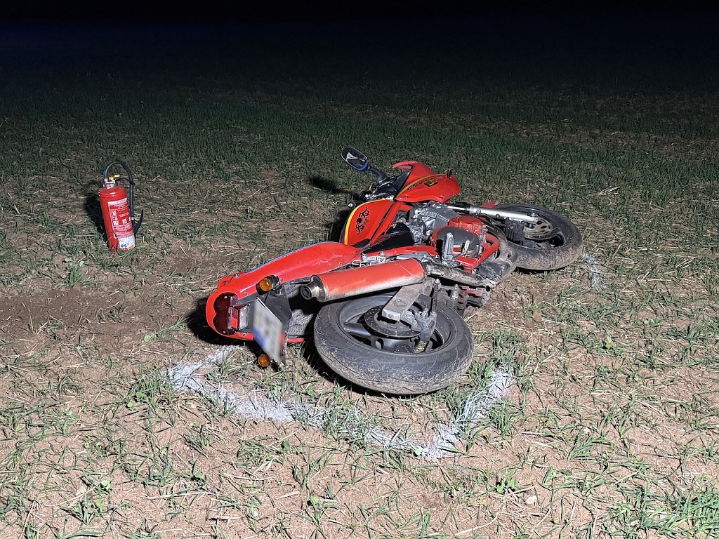 Nachdem er einen PKW überholt hatte, fuhr er auf der rechten Fahrspur weiter und prallte ungebremst in den Anhänger. Der Fahrer wurde von seiner Maschine gerissen und blieb auf dem Asphalt liegen. Das Motorrad rollte noch etwa 75 Meter auf einen Acker neben der Straße.