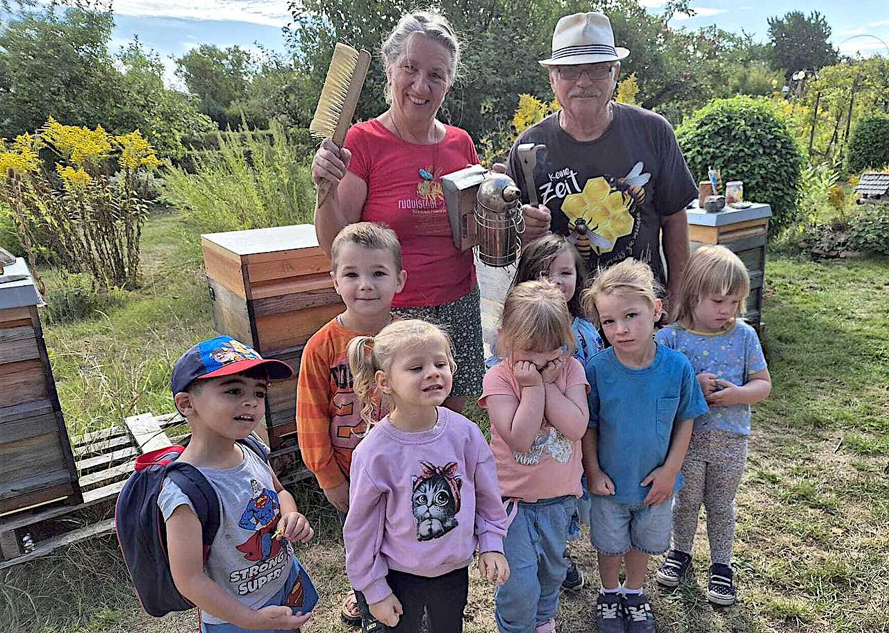 Wir bedanken uns recht herzlich bei den Imkern Maja und Willi für den wunderschönen Vormittag bei den Bienen. Die Kinder haben viel gelernt über die Natur und besonders die Bienen. Die Kinder und Erzieherinnen möchten gern wieder zu den Bienen fahren und noch mehr über die Natur erfahren. Gärten sind nicht nur hervorragende Spielplätze, sondern für viele Tiere und Pflanzen ein wichtiger Lebensraum. Unsere Pädagogen stehen vor der Aufgabe, Lernprozesse im Sinne einer Bildung für nachhaltige Entwicklung den Kindern zu ermöglichen, erfahrungs- und handlungsorientiert auszurichten. Für Kindereinrichtungen besteht die Herausforderung, ein Ort nachhaltiger Entwicklung zu sein. Die Persönlichkeitsentwicklung der uns anvertrauten Kinder in möglichst realen Lebenssituationen anschaulich zu gestalten, trägt wesentlich für das Gelingen von Umweltbildung bei, so die Kitaleitung abschließend.