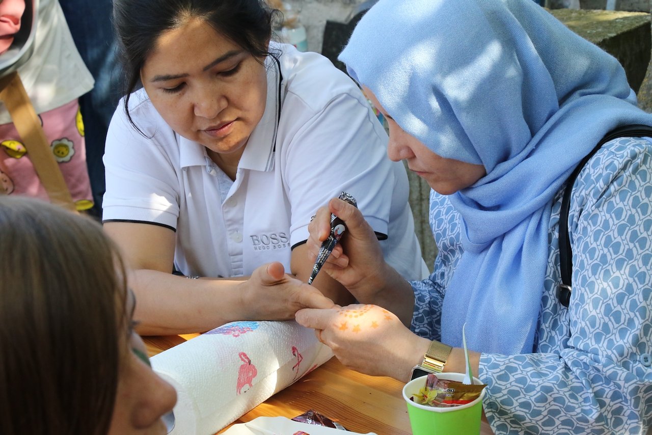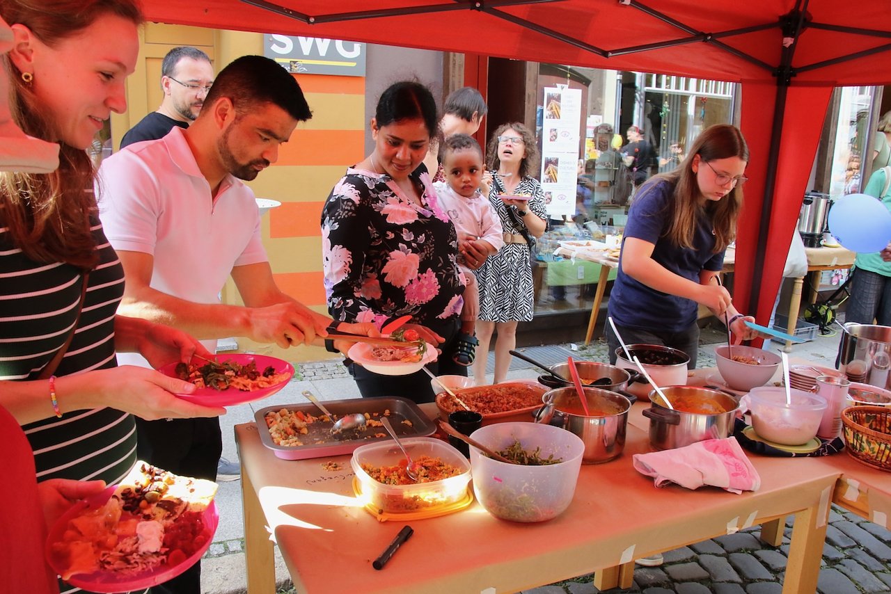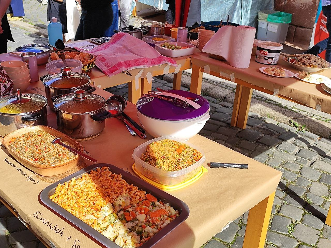 Grüße für das Radio-Enno aufnehmen, Hand- und Kinderschminken, auf die Feuerwehrleiter klettern oder über den Hindernisparcours fahren - für die jungen Besucher gab es jede Menge zu tun. Kurz nach dem Mittag wurde in der Kurzen Meile dann zu Tisch gebeten - der Verein Schrankenlos lud zum traditionellen "Essen der Kulturen". Die Köstlichkeiten aus aller Welt wurden von den Gästen selber mitgebracht und geteilt und in trauter Gemeinsamkeit genossen.