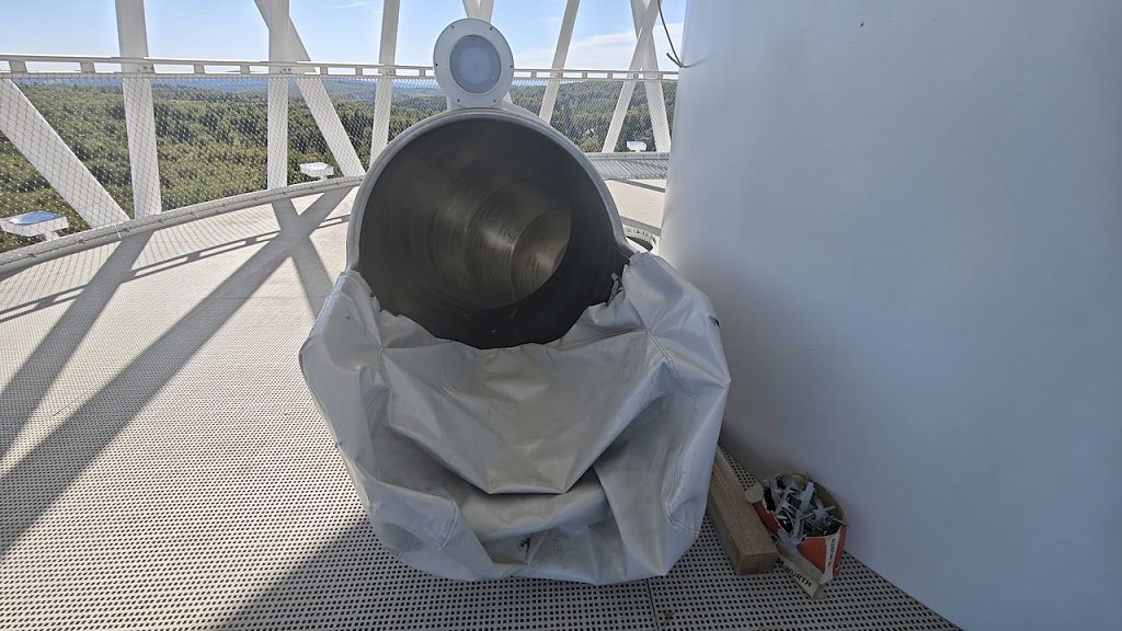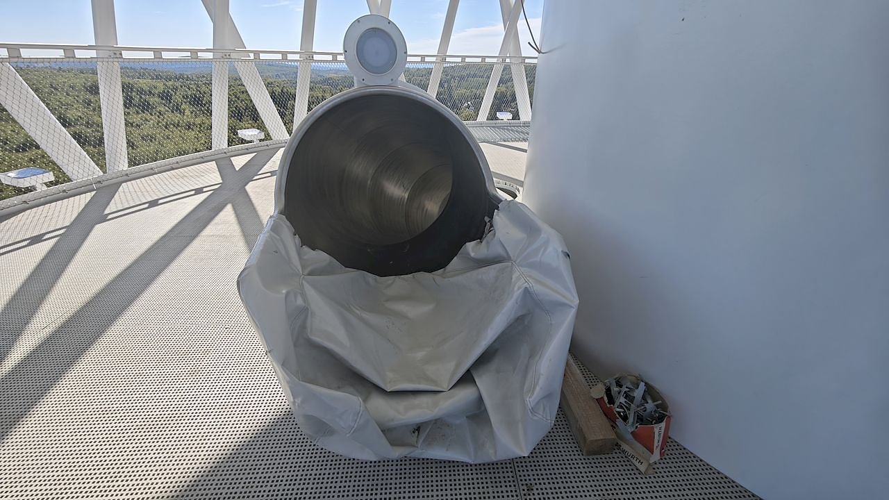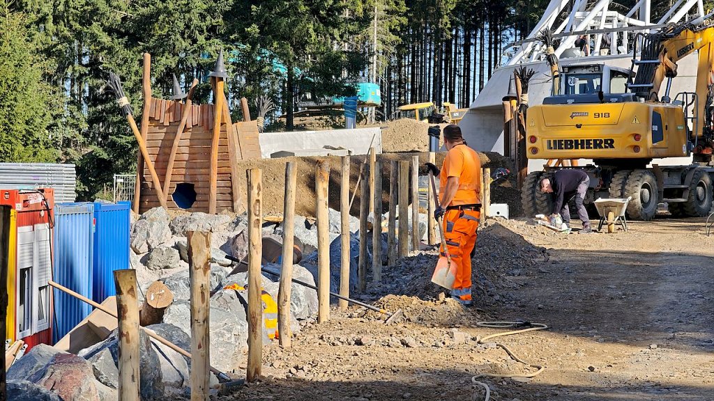 Nun stehen die Bauarbeiten kurz vor dem Ende, denn ab 1. Oktober soll die Erlebniswelt geöffnet sein. Zahlreiche Gewerke sind noch zu Gange und der Laie wie der Autor hat leise Zweifel ob der rechtzeitigen Fertigstellung. Gunnar Reuter, Geschäftsführer der Service GmbH und Standortleiterin Veronika Töpfer wissen um den Zeitdruck, sind trotzdem optimistisch. Es ist in der Tat ein Erlebnisreich geworden, das wir den künftigen Besuchern anbieten können”, sagt Reuter und Veronika Töpfer ergänzt: Zur Erlebniswelt gehört ja nicht nur der Turm mit seiner interaktiven Erlebniswelt im unteren Bereich, dazu gehören zum Beispiel auch ein Hexenzauberhaus, ein Kristallbergwerk oder eine Hexenflugschule und das alles barrierefrei.” Und der Besen? Der misst ganze 77 Meter und hat eine 100 Meter lange Rutsche. In 43 Meter Höhe befindet sich die Aussichtsplattform. Die kann man zu Fuß erklimmen oder man lässt sich mit dem eingebauten Fahrstuhl nach oben fahren.