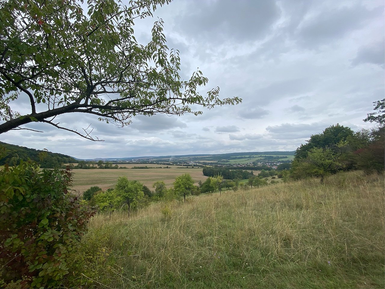 Man hat einen herrlichen Blick über unsere Stadt in alle Richtungen. Der September geht zu Ende und der Herbst hat nun Einzug gehalten. Er malt nicht nur die Blätter bunt, sondern lässt auch Äpfel, Birnen Pflaumen und anderes Obst und Beeren reifen. Auf abgeernteten Feldern liegen die Strohballen. Da blinkt es überall gülden, wenn sich die Herbstsonne über den Feldern ausbreitet, Wir Wanderer haben uns auf den Obstwiesen so manchen Apfel, Birne oder Pflaume schmecken lassen und diese so vor dem Verfaulen bewahrt. Aber wir Wanderer schaffen es leider auch nicht, das ganze gewachsene Obst vor dem Herunterfallen und Verfaulen zu bewahren. In anderen Regionen unserer Erde verhungern Tausende Menschen, darunter viele Kinder. Kann man da zwischen den Eigentümern der Streuobstwiesen einerseits und zum Beispiel den Tafeln oder auch Schulen andererseits etwas organisieren? Das könnte sicher Vielen helfen.