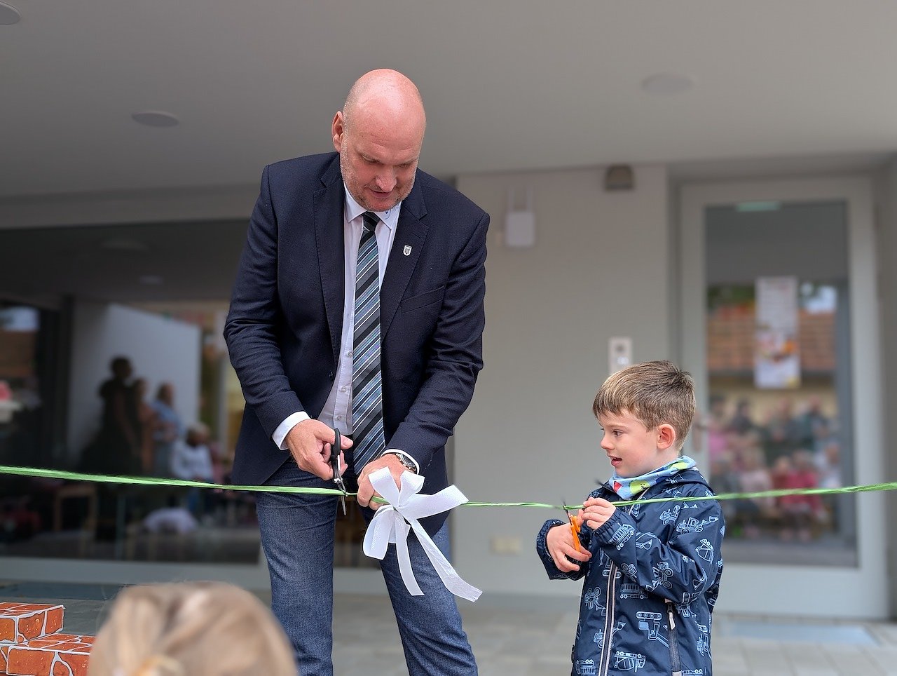Der große und der kleine Bürgermeister durchschnitten das Schleifenband und gaben die Kita offiziell frei (Foto: Janine Skara)