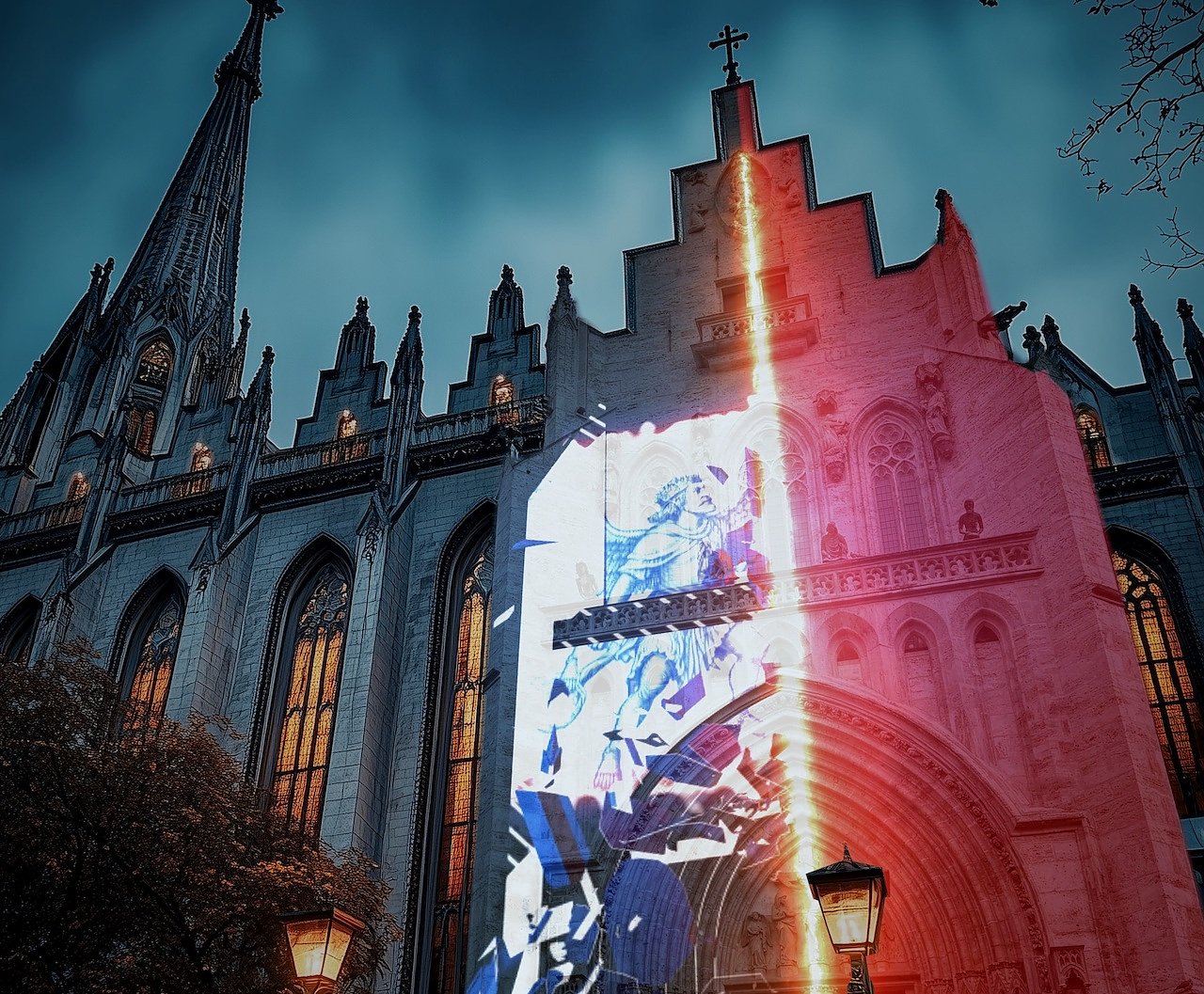Allerheiligenkirche: Bernd Gengelbach (Lichtkunst), Sandro Schleier (Grafik) und Stefan Sell (Sound) inszenieren eine interaktive Projektion, die Besucherinnen und Besucher in historische Szenen einbindet.