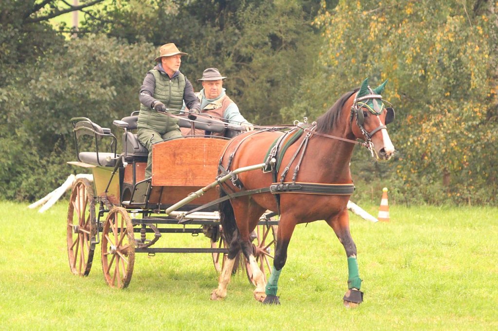 Eine Premiere hatte der einzige Teilnehmer, welcher nur ein Pferd angespannt hatte- Marco Müller aus Stempeda stellte sich mit dem Deutschen Sportpferd Quirinus den Aufgaben. Beide sind Anfänger auf ihrem Gebiet und meisterten die Geländefahrt und den Parcours ohne Probleme.