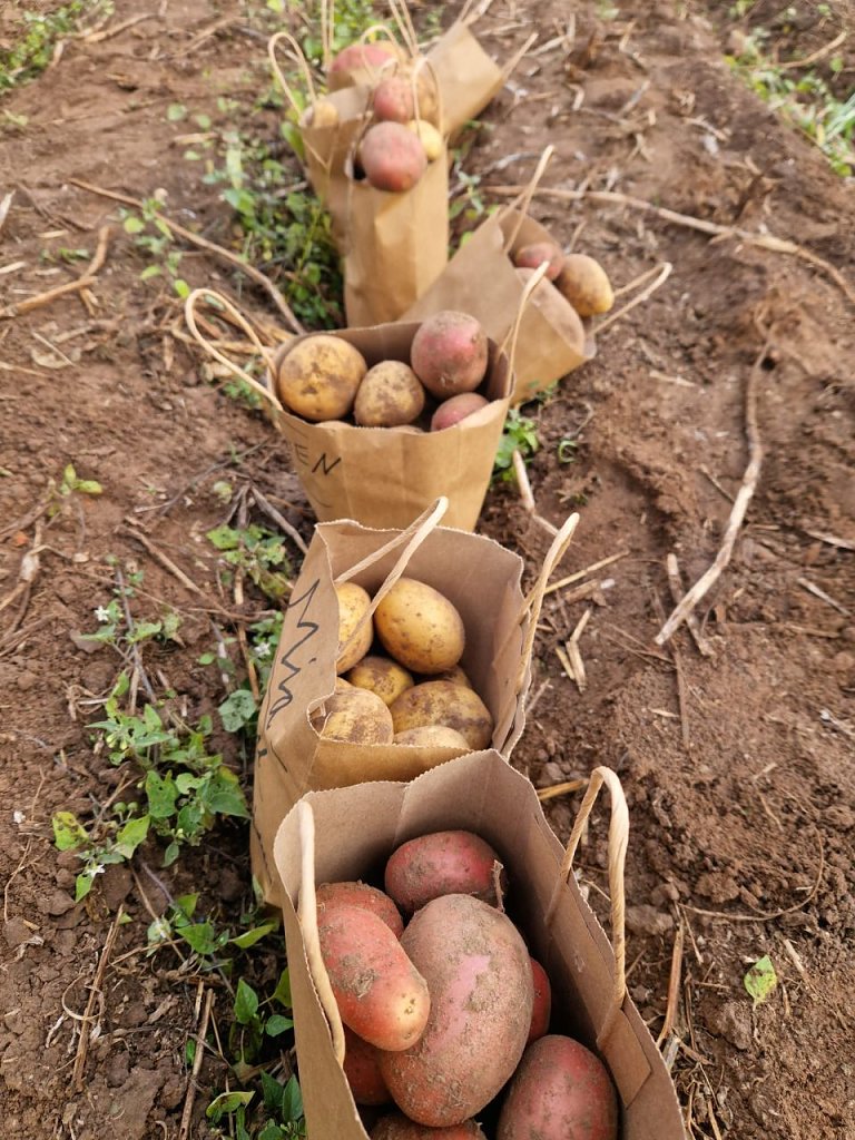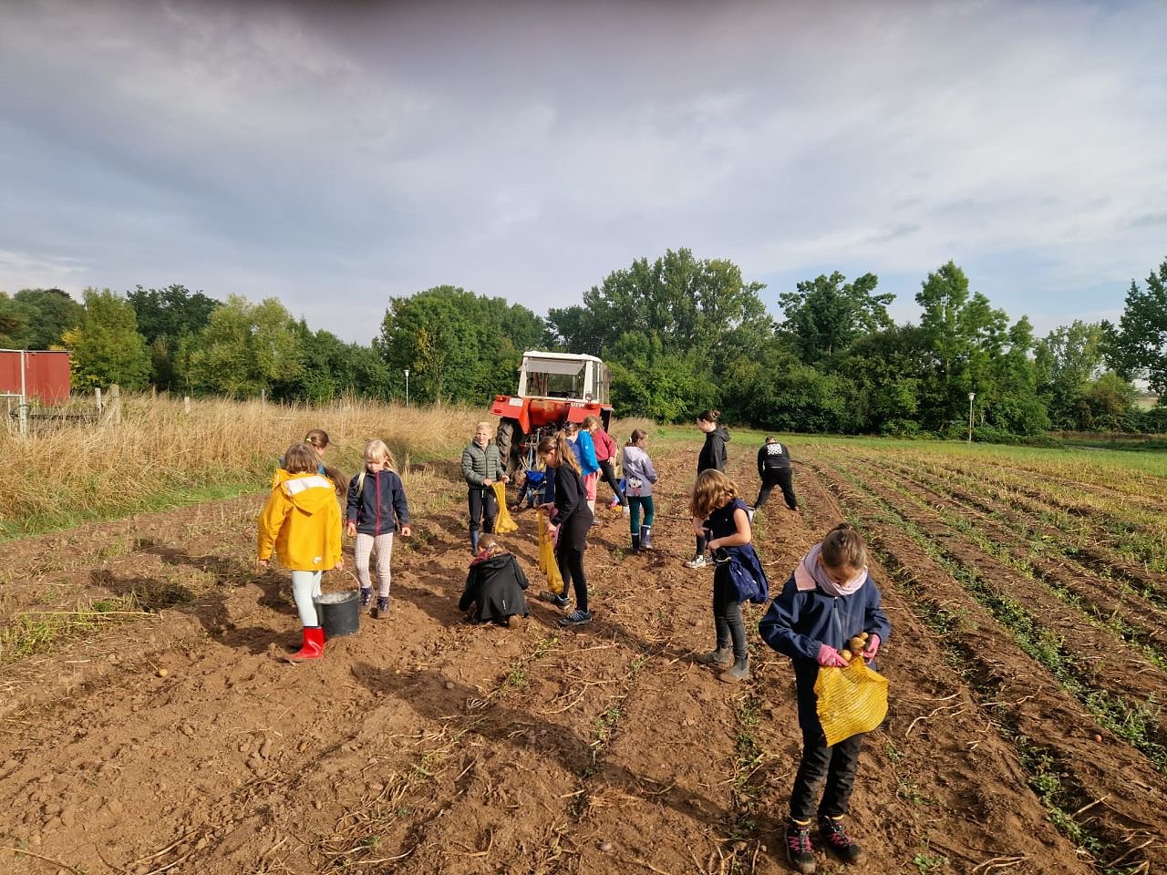 Als alle zwei Klassen da waren, ernteten sie zusammen. Die Kinder durften Tüten mit Kartoffeln vollmachen und sie mitnehmen. Daraus wurde zuhause u.a. Kartoffelsuppe gemacht. Luca und Theo suchten in der ersten Runde nur kleine Kartoffeln und waren sehr erfolgreich. Aiden stellte fest: Die Kartoffeln hatten so schöne Farben, rot und gelb. Am Ende hatten die Kinder nicht nur ihre Tüten voll, sondern auch einen riesigen Kartoffelkäfig.