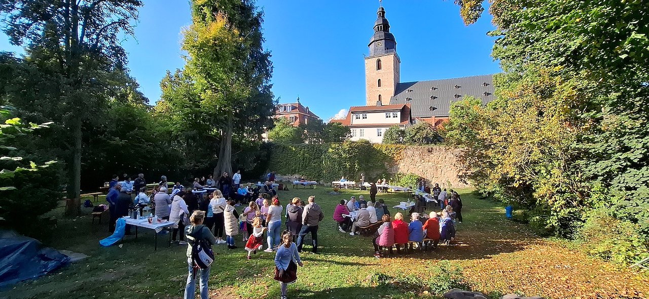 Zur "Internationale Kochshow 2025" trafen sich Gemeindemitglieder im Pfarrgarten der Trinitatisgemeinde in Sondershausen (Foto: Karla Kreyer)