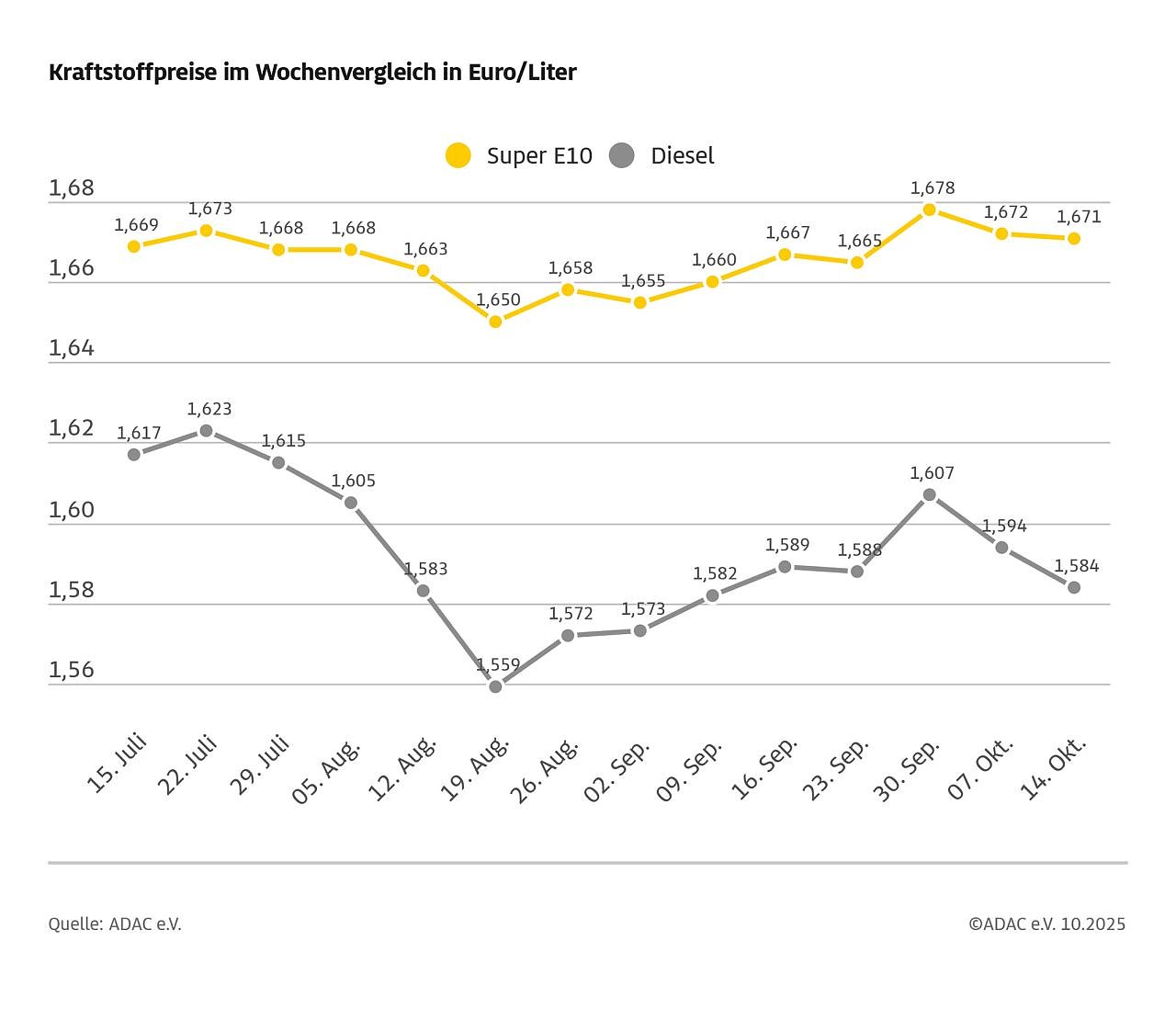 Ein Liter Super E10 kostet derzeit im Mittel 1,671 Euro – das sind 0,1 Cent weniger als noch in der Vorwoche. Diesel verbilligte sich um 1,0 Cent und liegt aktuell bei 1,584 Euro je Liter. Damit setzt sich der Trend leicht sinkender Preise fort, bei Diesel erneut deutlicher als bei Benzin.