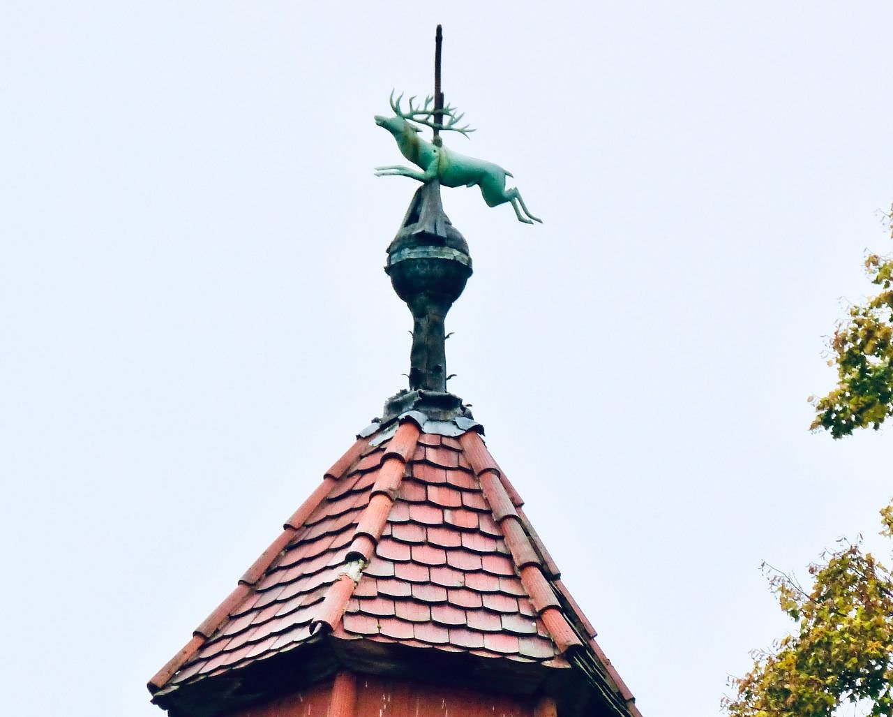 Der Bau der Neanderklinik stammt aus dem 19. Jahrhundert, doch der Dachreiter mit Hirsch verweist auf ältere Traditionen. Solche Aufbauten – sogenannte Dachreiter – dienen nicht nur der Gliederung eines Gebäudes, sondern oft auch als Träger symbolischer Botschaften. In diesem Fall ist es der Hirsch, der die Aufmerksamkeit auf sich zieht. Und das ist nicht zufällig.